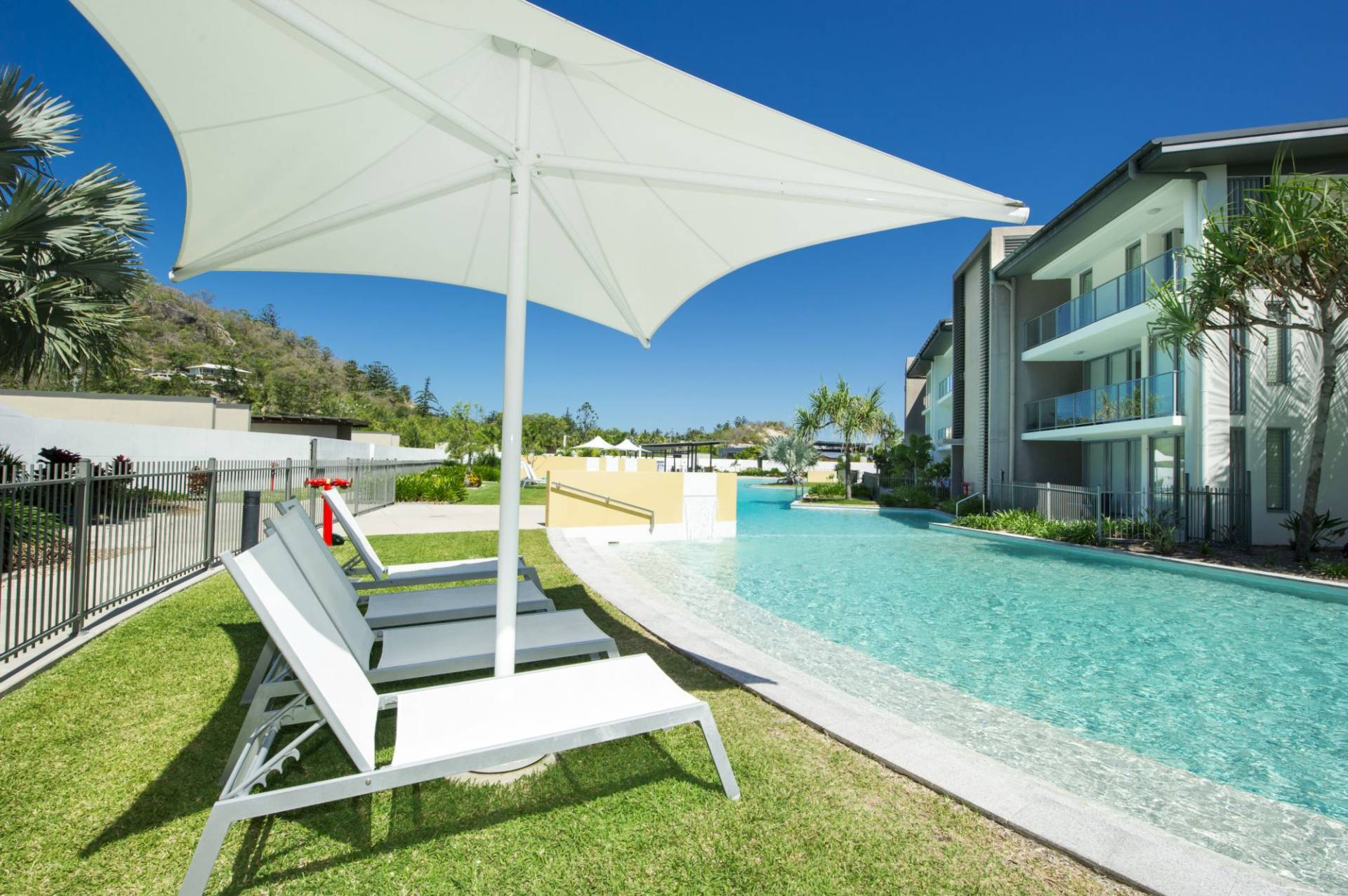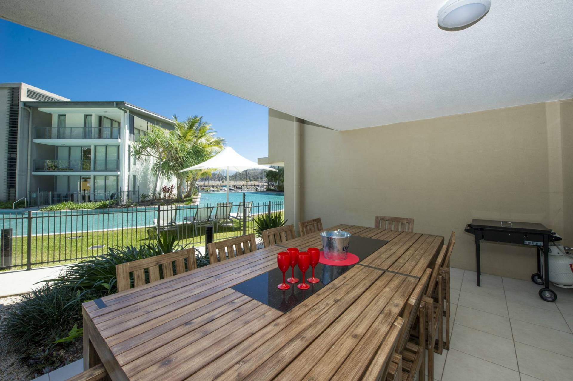 Overlooking the enormous lagoon pool and marina, this spacious ground floor apartment is currently a popular holiday rental with families who can sit on the shady covered verandah and keep an eye on the kids in the pool just in front.