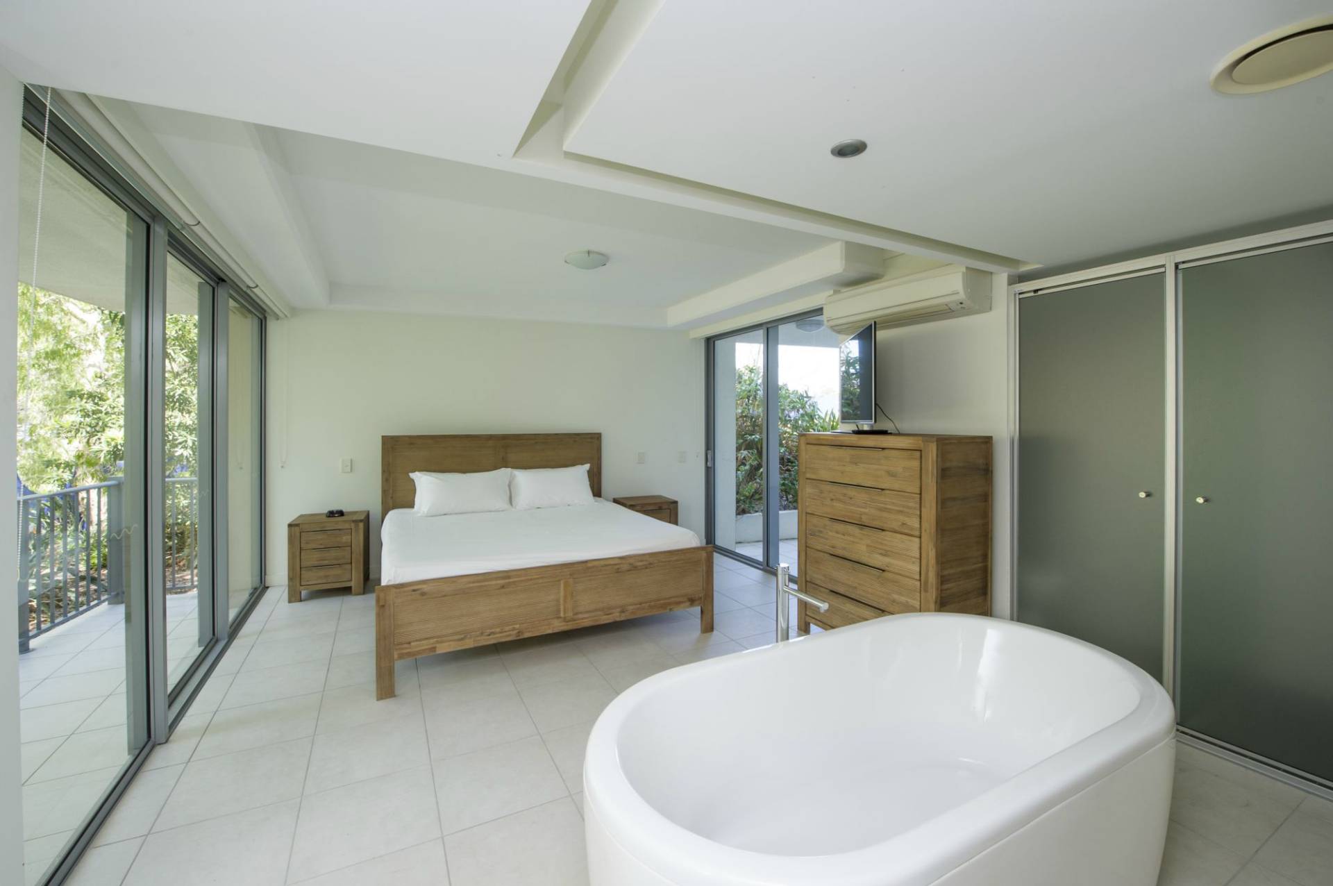 The master bedroom opens onto not one but two private balconies and features an integrated ensuite with stand-alone bath, rainhead shower and marble benchtop to the vanity.