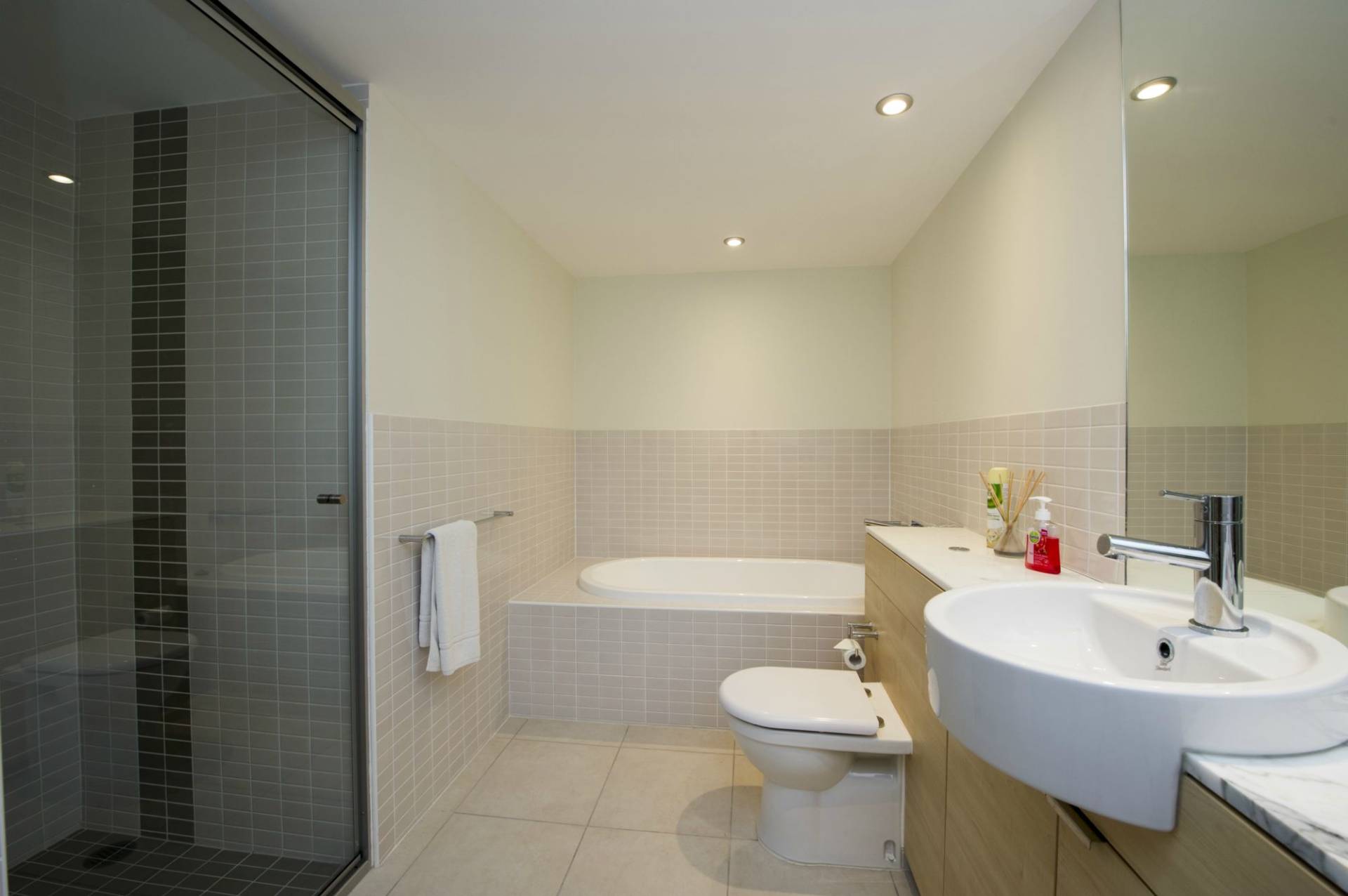 The main bathroom is large for an apartment - with bath, separate shower and stylish marble vanity.