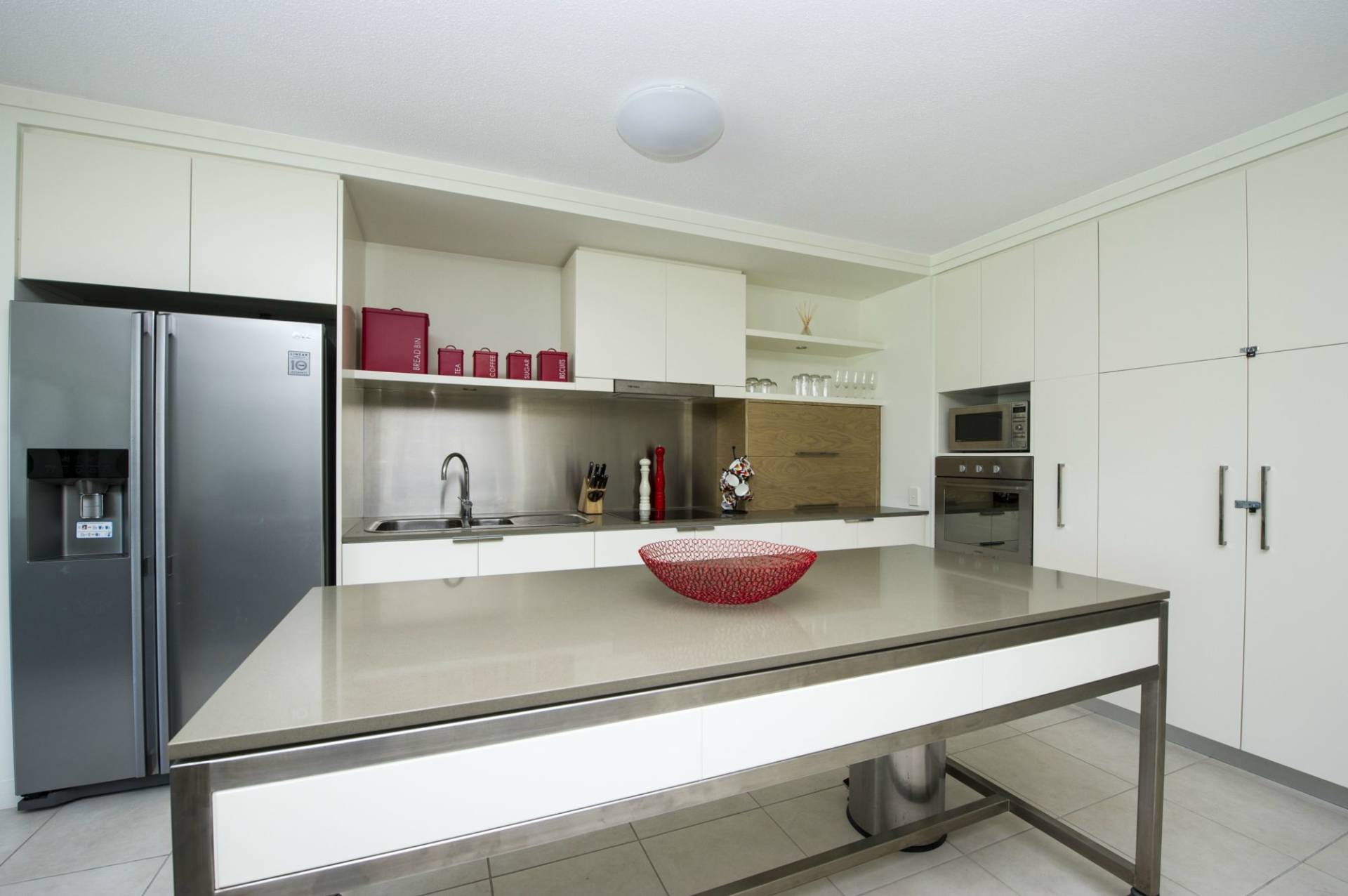 The stylish kitchen has a moveable island bench, loads of cupboard space, drawer dishwasher and double door ice-maker fridge.