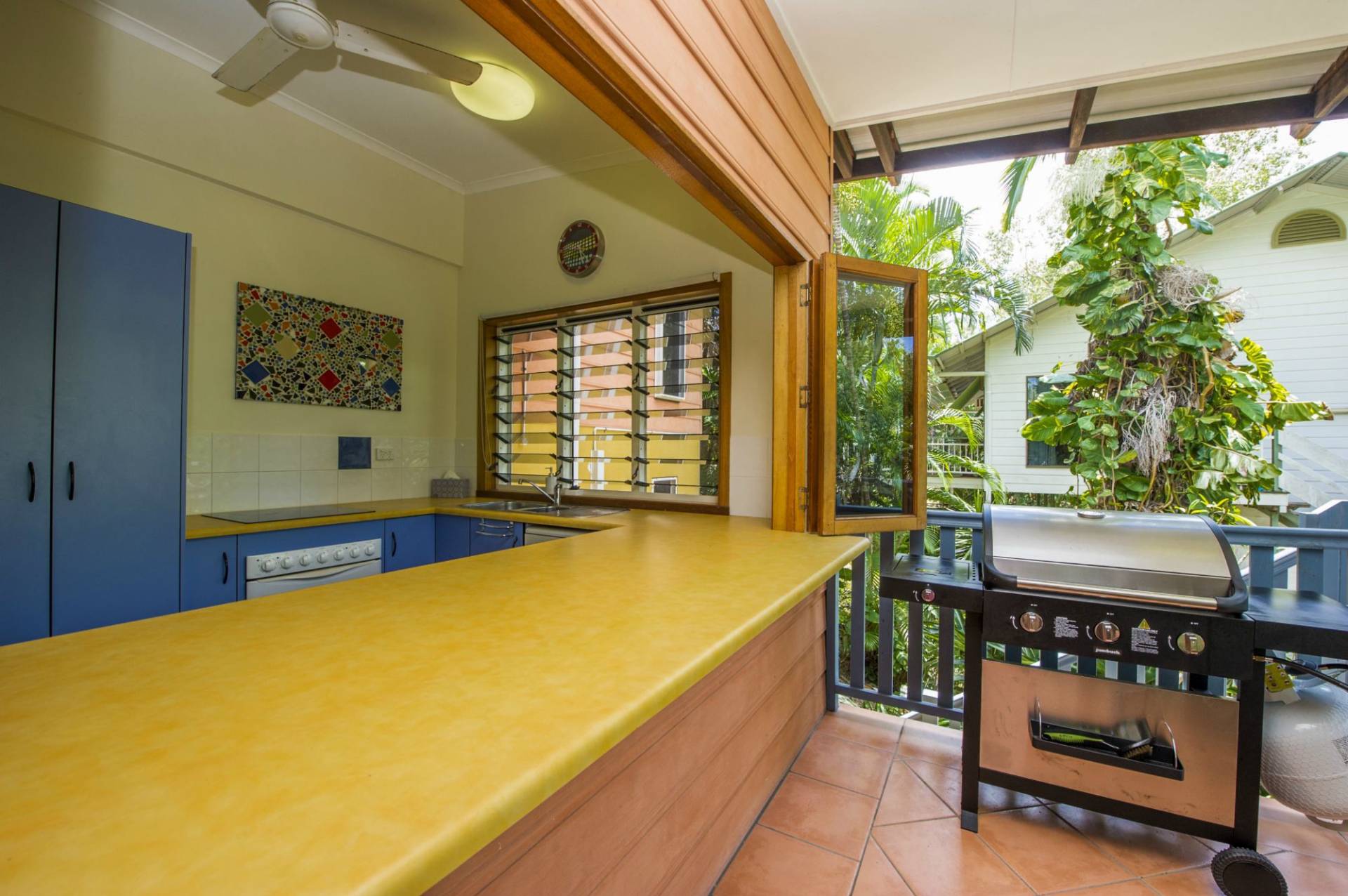 * kitchen with good bench space, dishwasher and bi-fold windows creating a servery to balcony