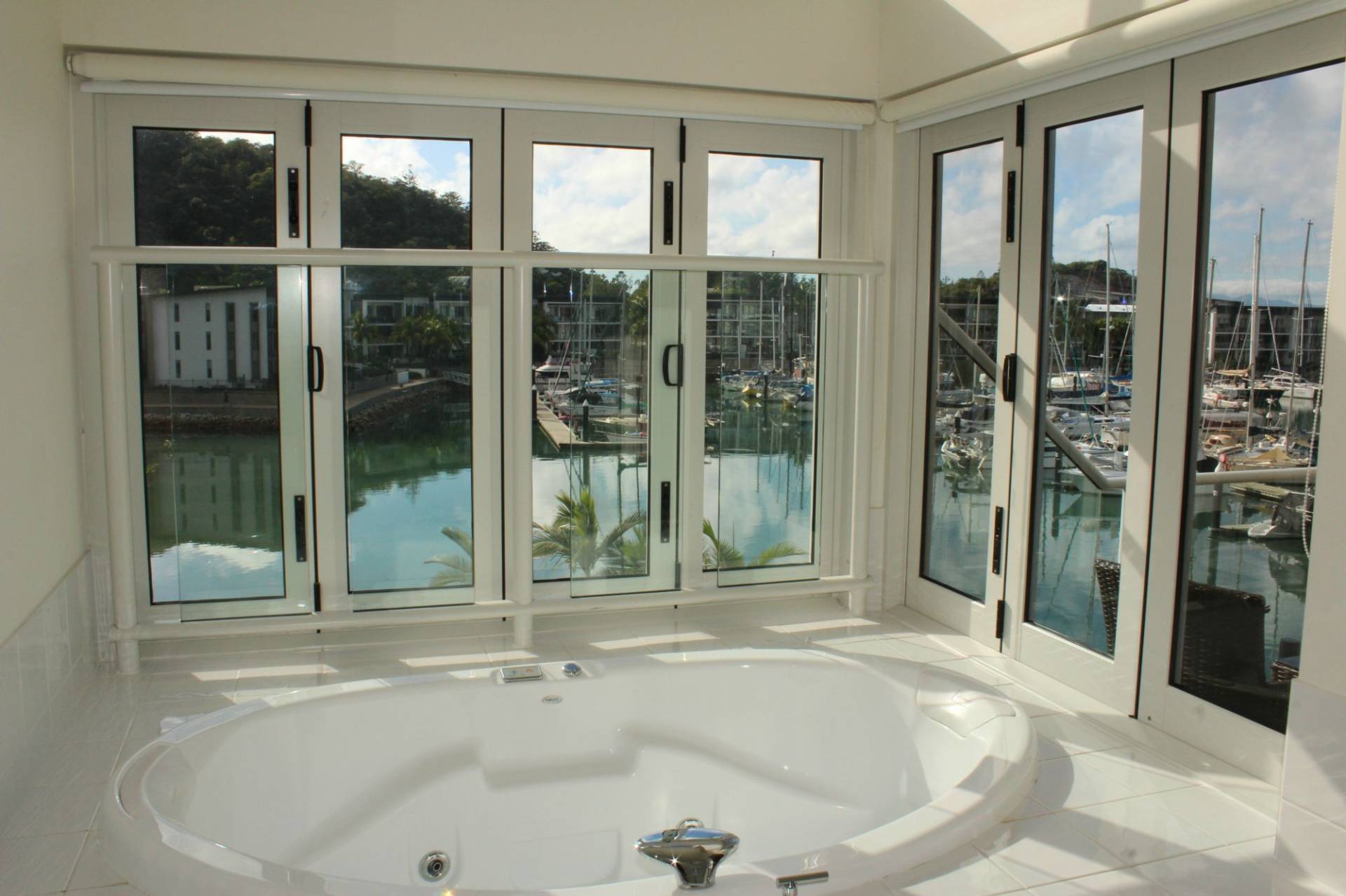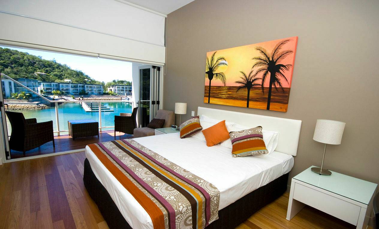 Upstairs, the spacious master bedroom opens onto a balcony with views over the marina and Coral Sea, and has a large walk-in wardrobe and ensuite bathroom with a luxurious spa bath, shower and his-and-hers vanities.