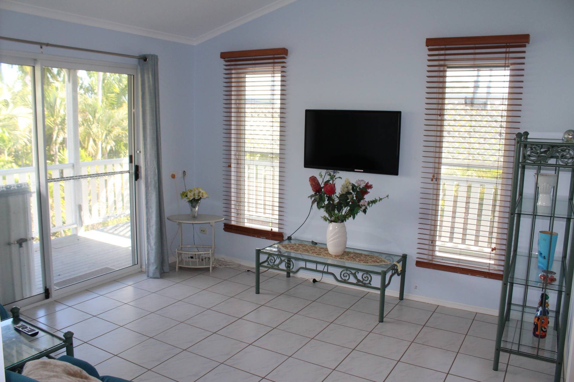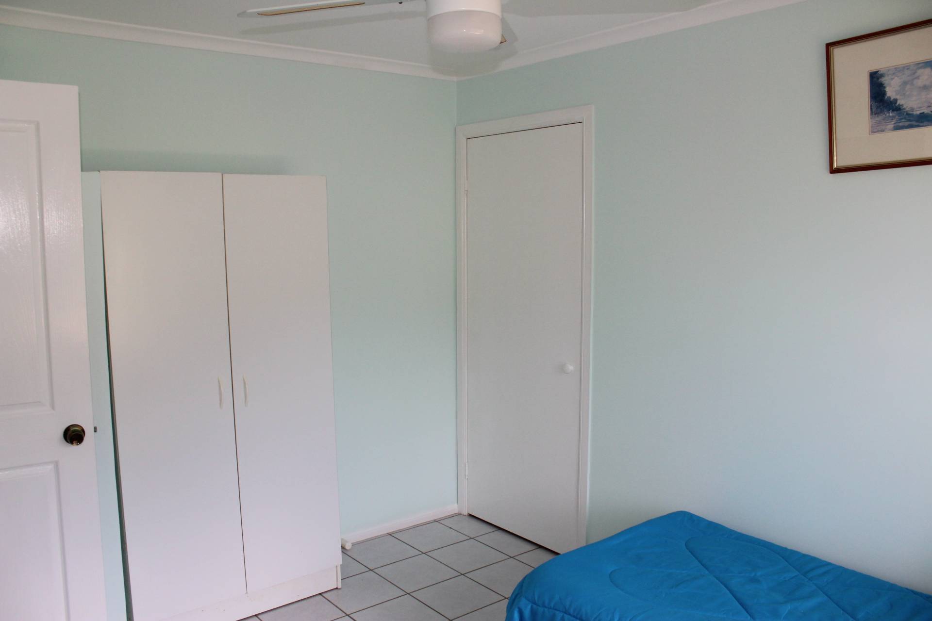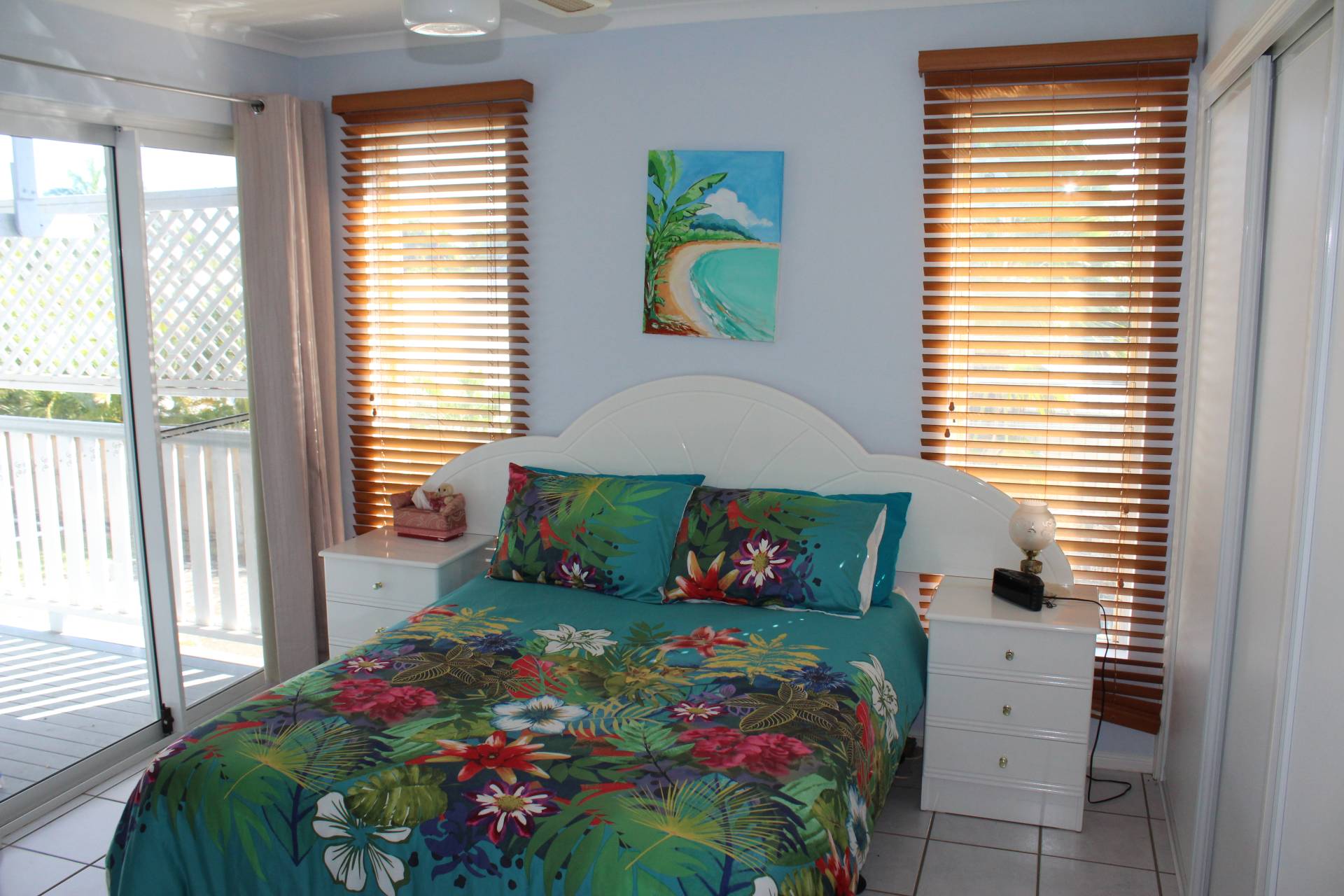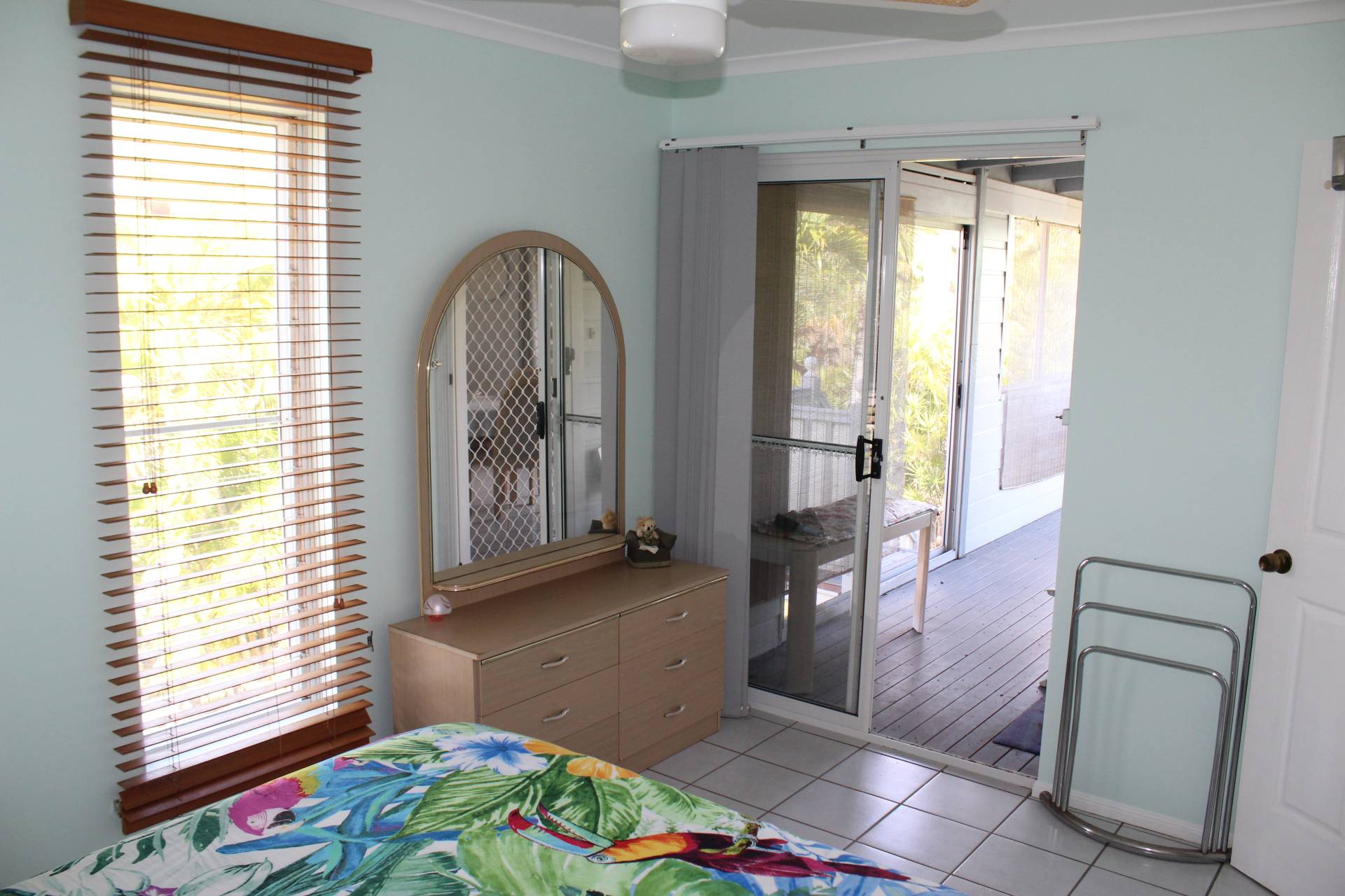 The master bedroom access is off the back living area, currently set up as the lounge, and also has its own door out onto the back deck. It is spacious with large built-in-wardrobes and an ensuite shower, toilet and vanity.