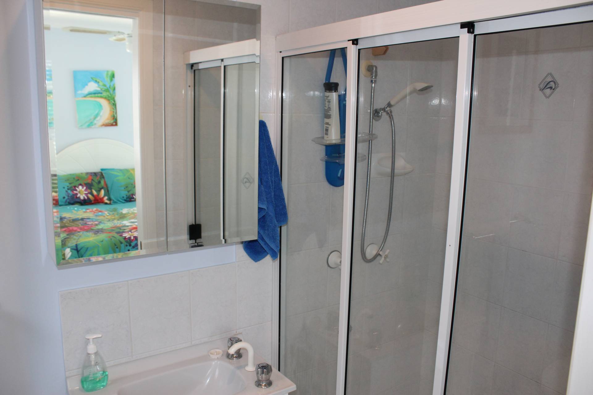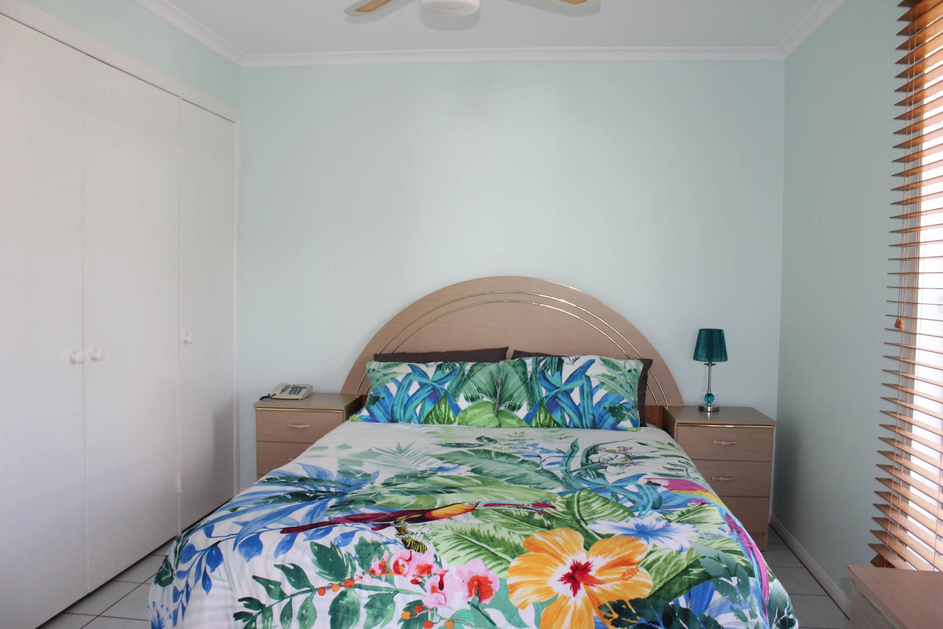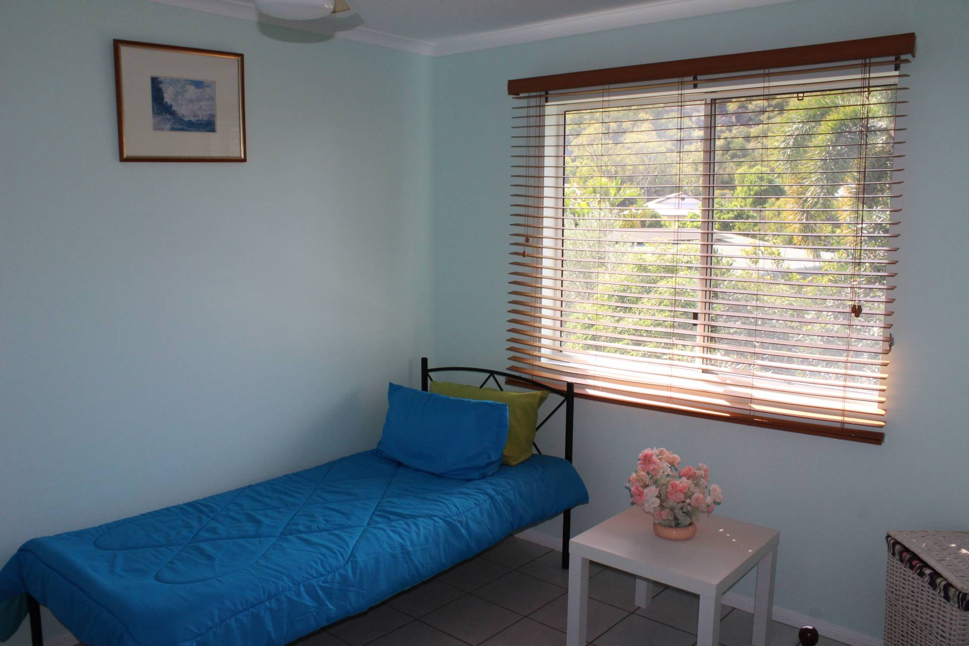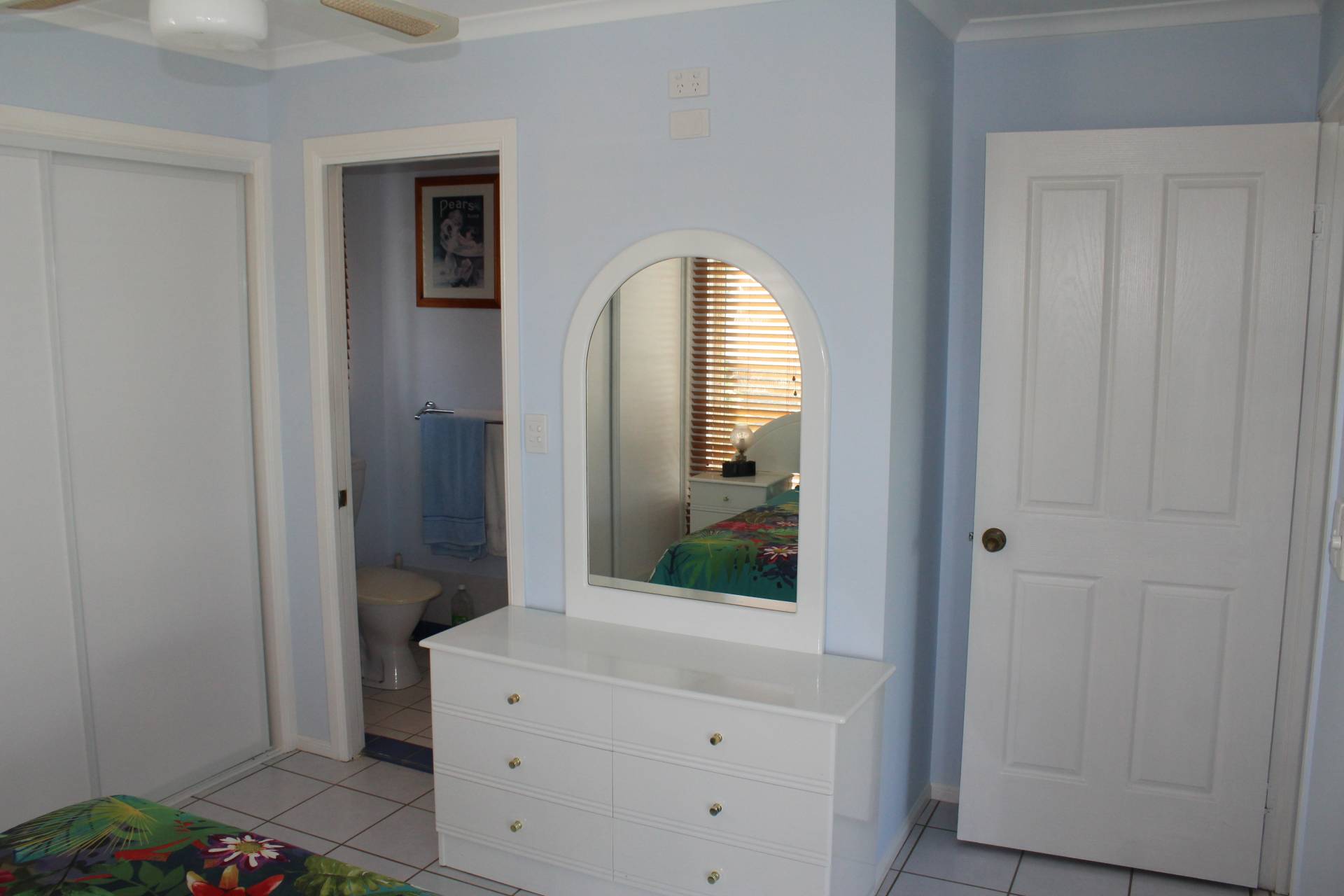 The master bedroom access is off the back living area, currently set up as the lounge, and also has its own door out onto the back deck. It is spacious with large built-in-wardrobes and an ensuite shower, toilet and vanity.