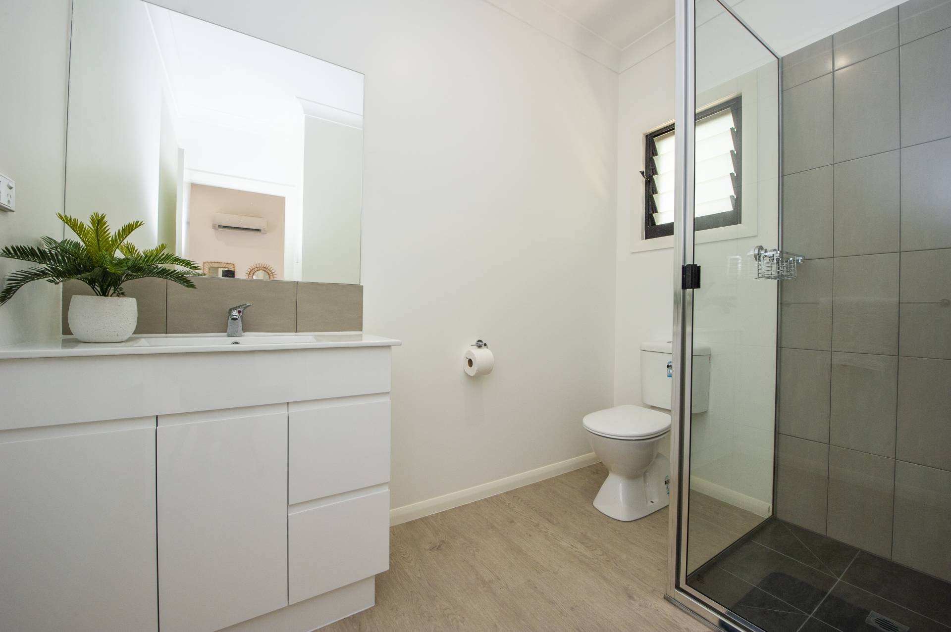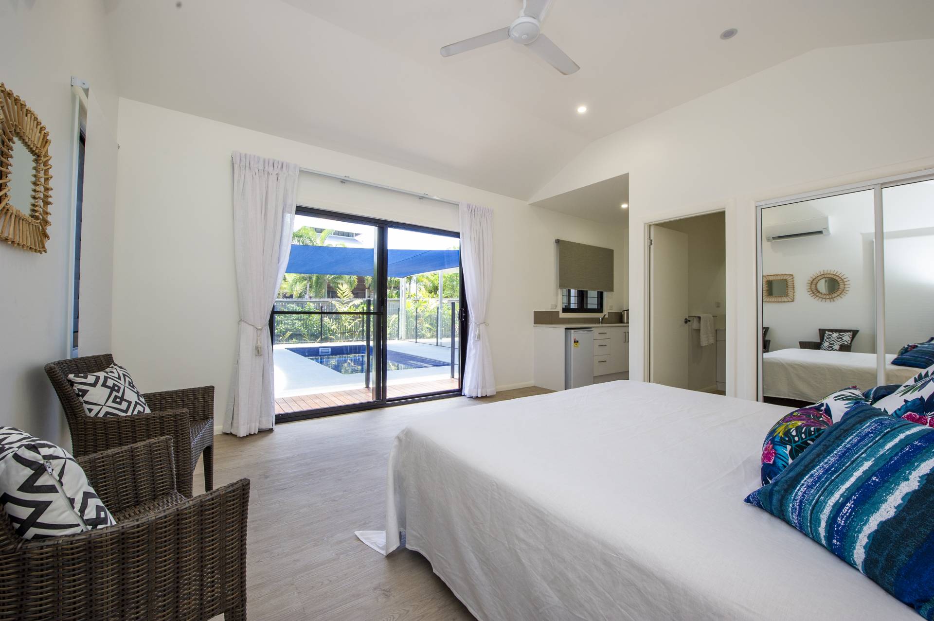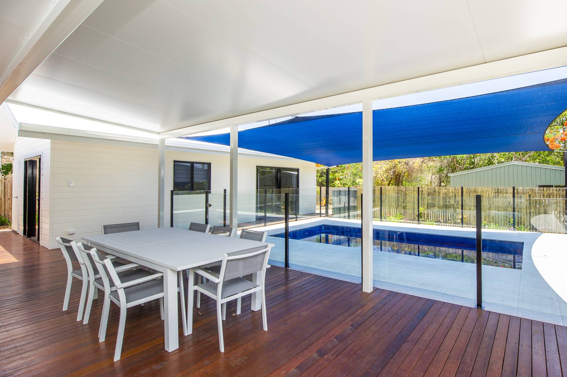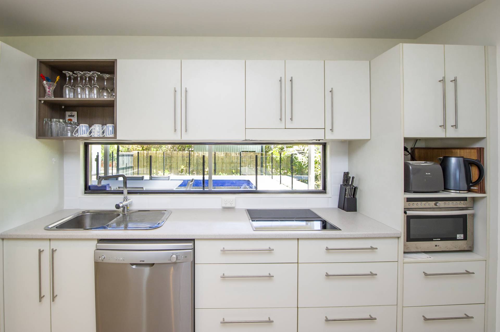 The lounge opens up through a wall of sliding glass doors so as to maximise the view and allow the cool sea breezes to flow freely through. The dining room also enjoys the view whilst the kitchen features a picture window out to the pool and treeline of the creek behind. A door leads out to the extensive covered decking which provides a second lounge and dining area overlooking the new sparkling swimming pool, ideal for the kids to play in and to cool off after a day on the beach or koala-spotting on one of the National park trails. The guest pavilion opens off the deck to reveal a large bedroom, kitchenette and ensuite bathroom. The laundry is easily accessible tucked away of the deck between the two buildings.
