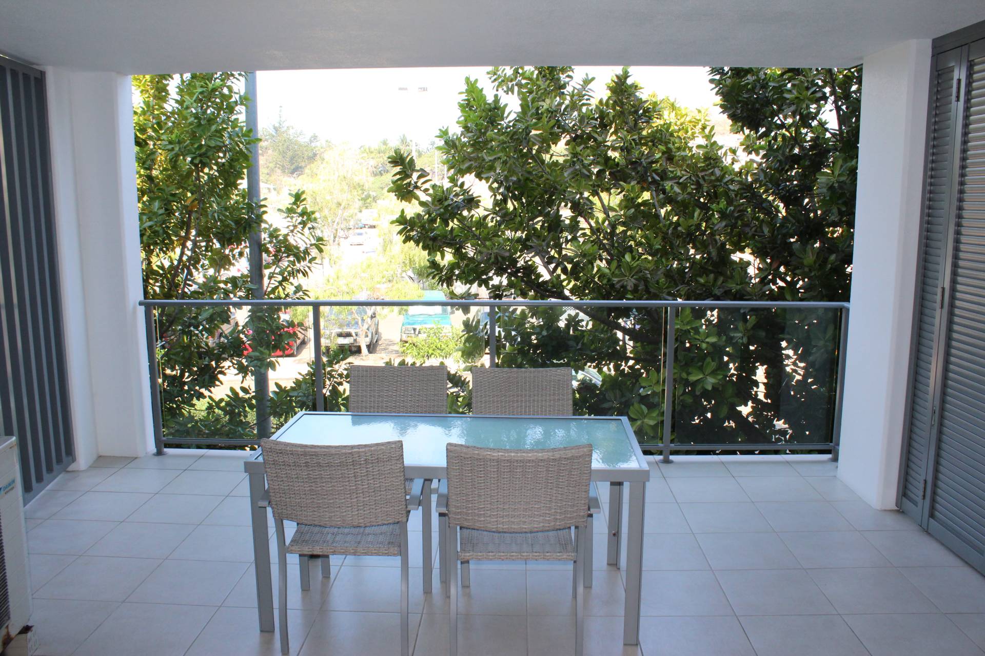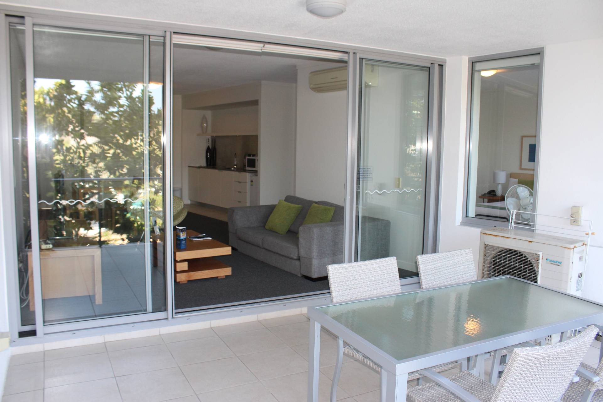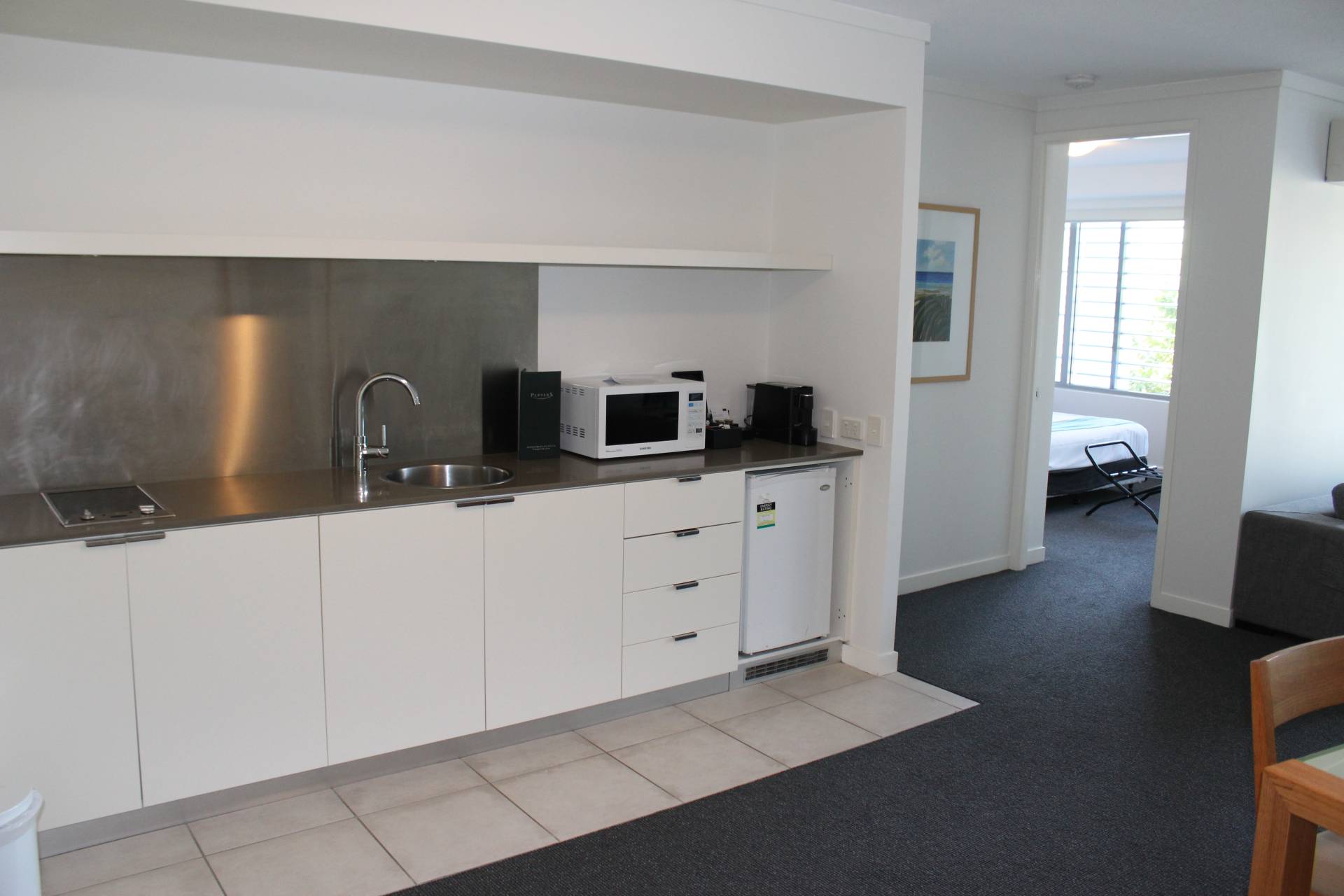 Adjacent is the studio unit, which is hotel room style with separate bathroom and bedroom/lounge combined opening onto a small covered balcony. This is ideal for short stays or can be let out for income whilst you stay or live in the apartment. Open up the louvred privacy shutters on the balcony to turn it into a two bedroom, two bathroom apartment if you need more space or when you have guests visiting.