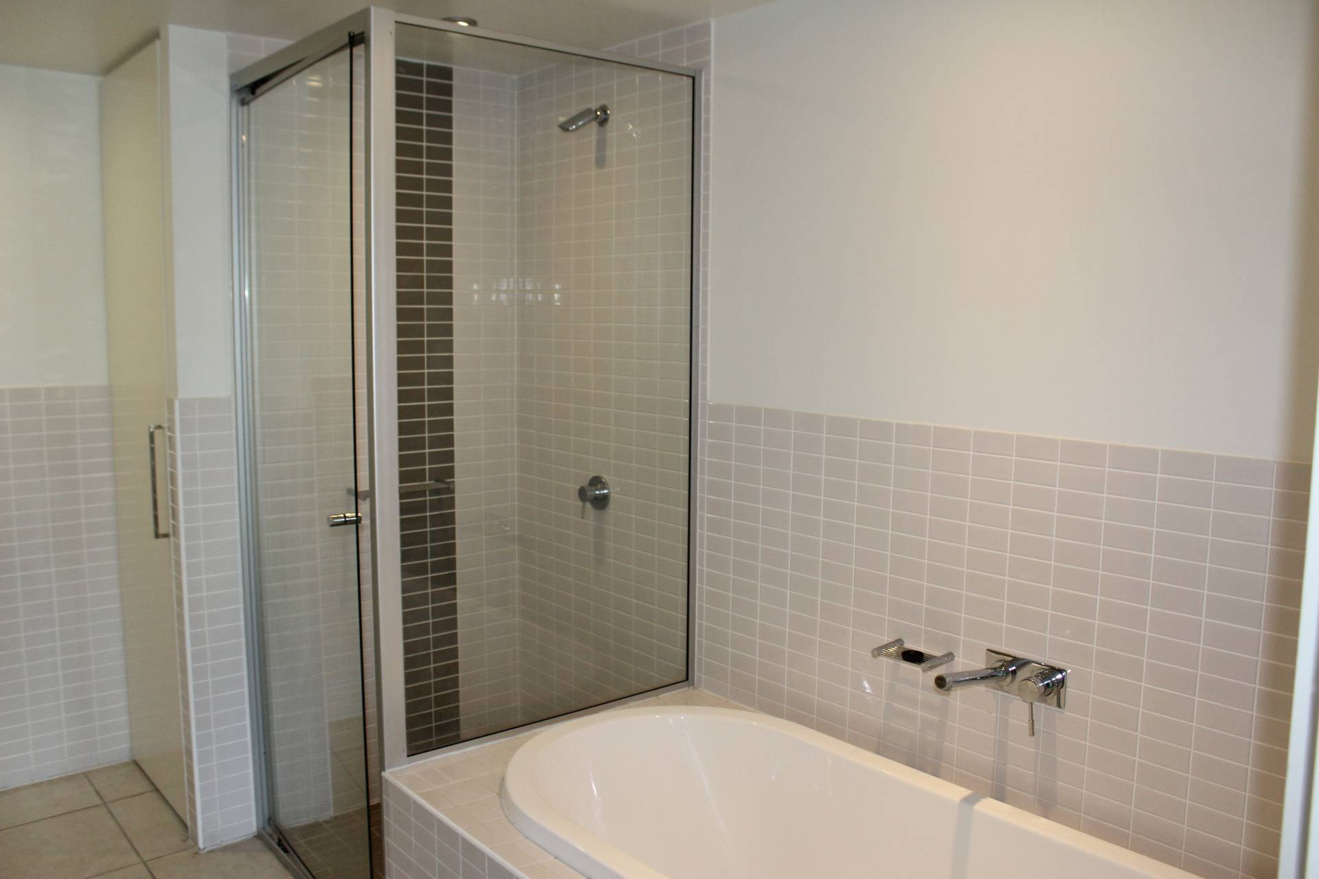 The one bedroom apartment offers a private bedroom with ensuite bathroom featuring a bath, separate shower, and smart vanity with stone benchtop. The living area is spacious with kitchenette, dining area and lounge area, opening through large floor to ceiling glass doors onto the generous covered verandah, from which limited water views can be seen.
