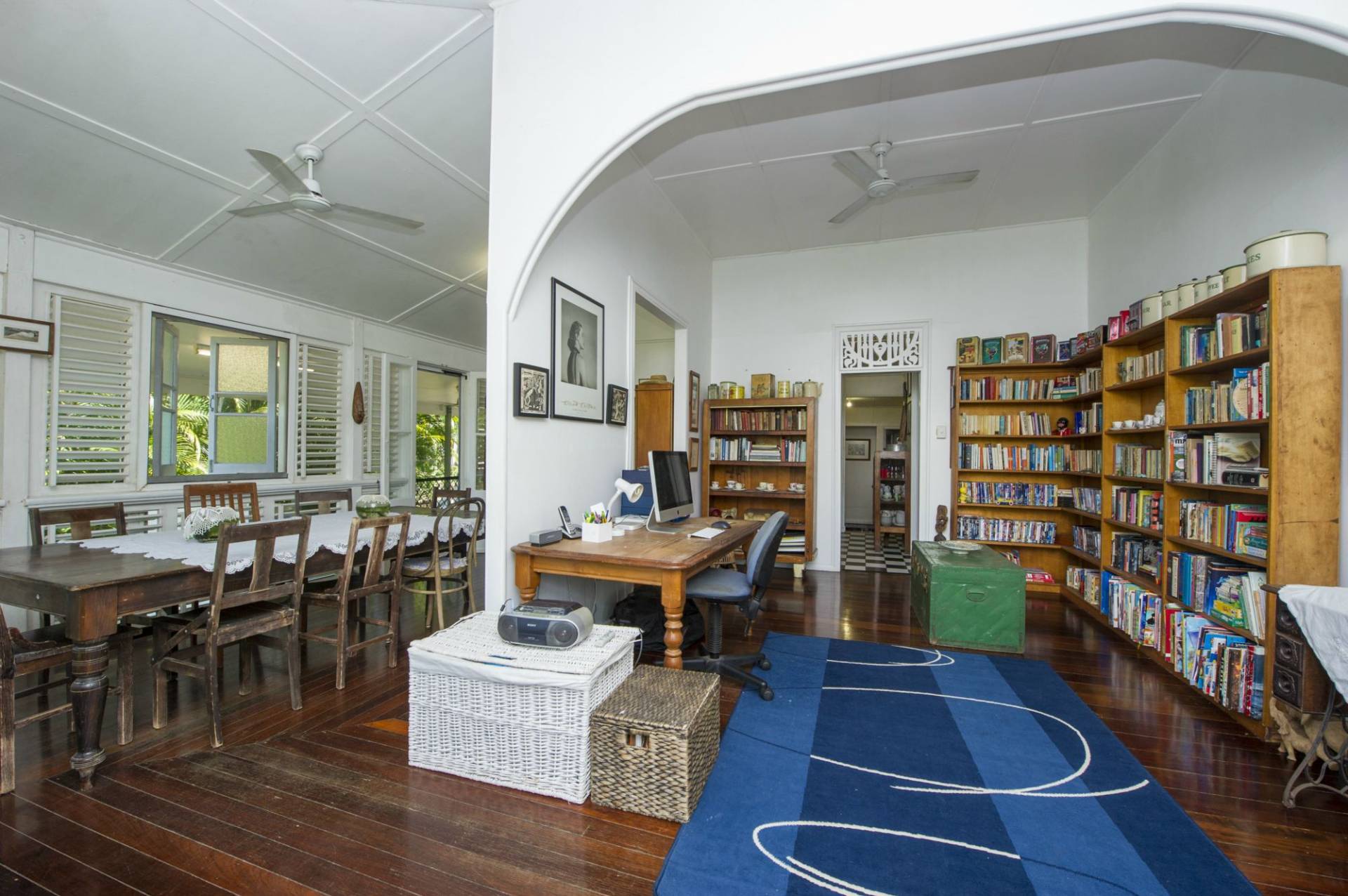 This unfurnished original Queenslander in Olympus Crescent, built around 1920, is a classic hip-roofed house with glazed casement windows and timber louvers allowing light and air into the many rooms. Walking up the front steps into the living area, you find polished wood floors, ceiling fans and loads of character. Archways, sloping ceilings and lattice work make exploring the six main rooms of this house fascinating, and give plenty of opportunity for various living options.