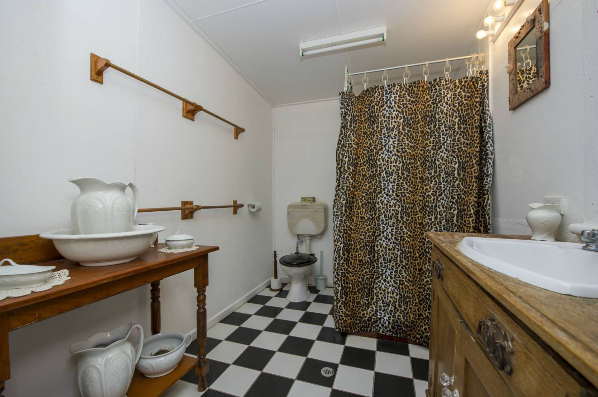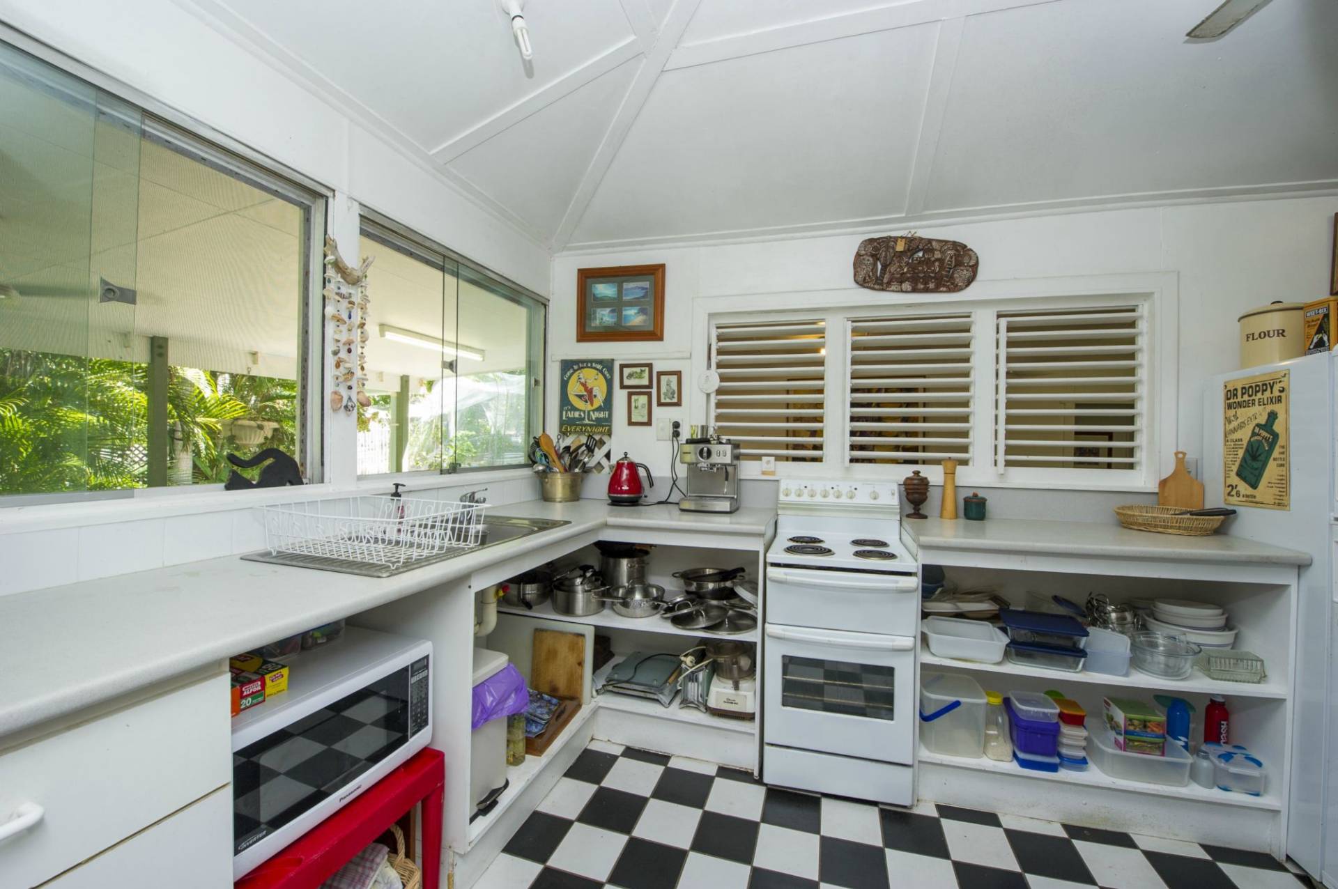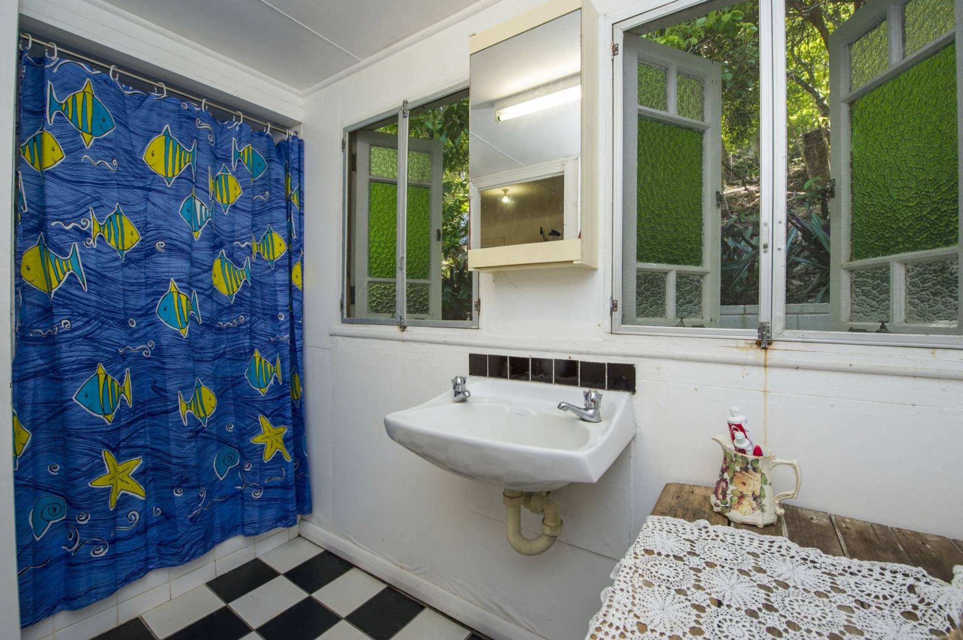 The kitchen has high benches that make excellent work surfaces and open cupboards. Black and white tiles on the floor complete the historical beach house look. The home has two bathrooms and a separate toilet.