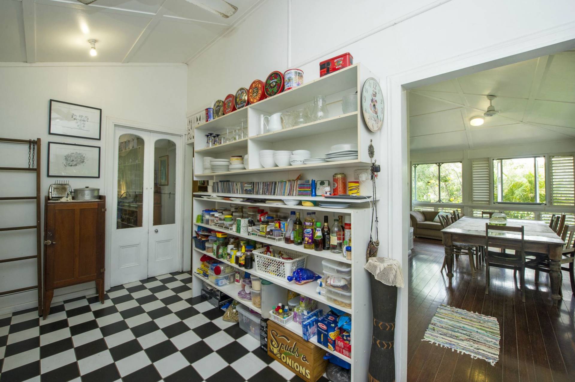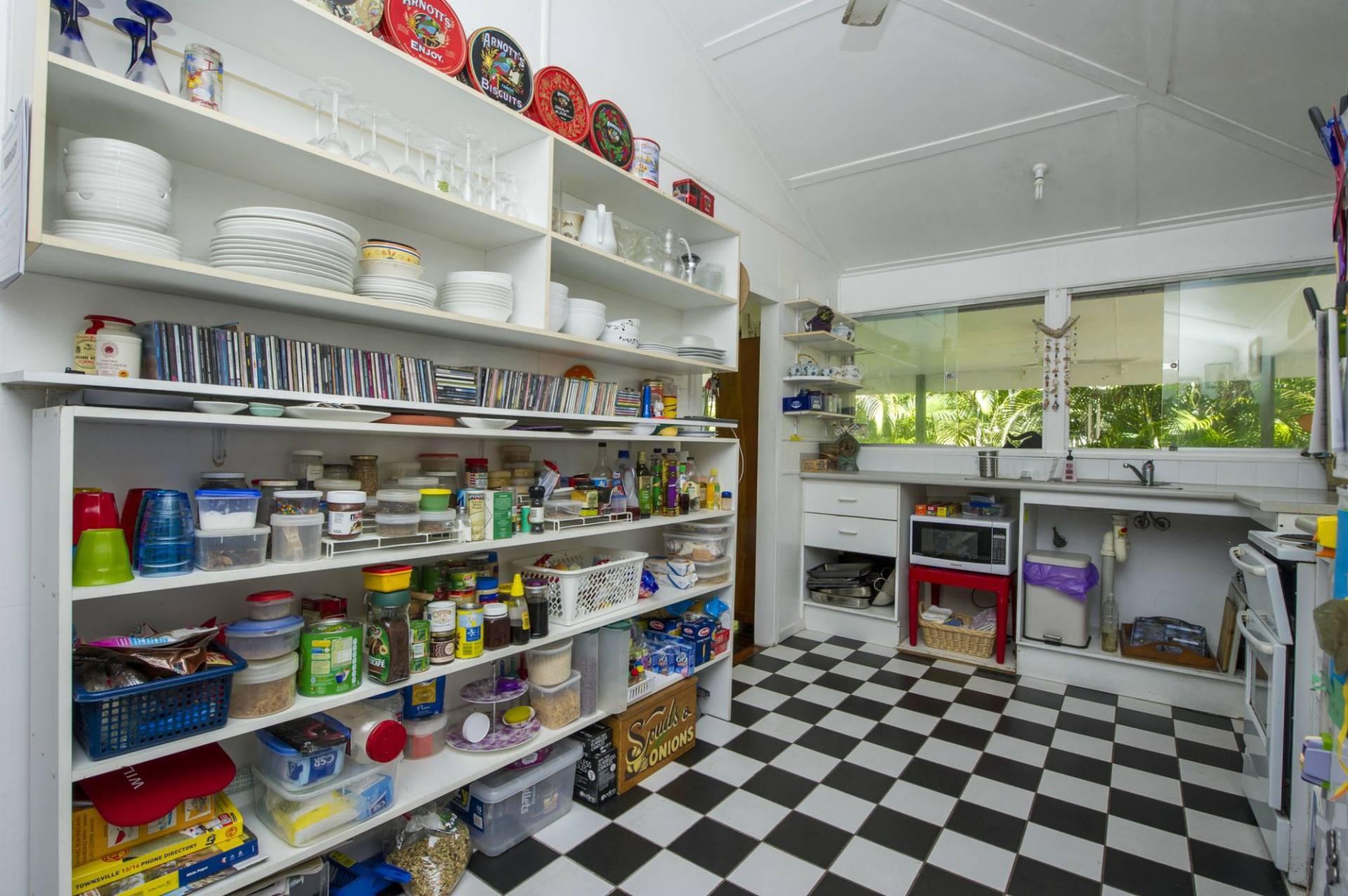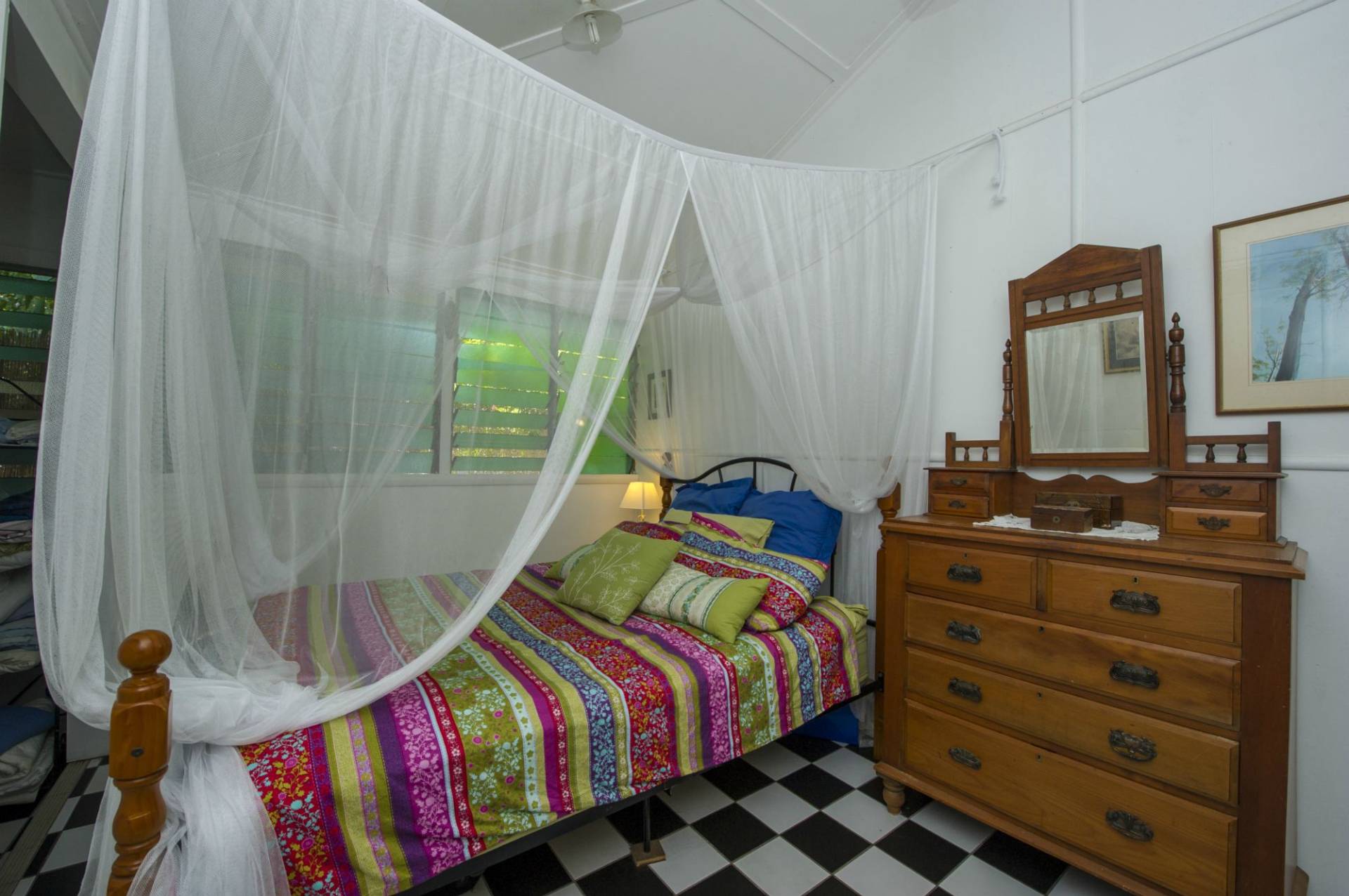 The kitchen has high benches that make excellent work surfaces and open cupboards. Black and white tiles on the floor complete the historical beach house look. The home has two bathrooms and a separate toilet.