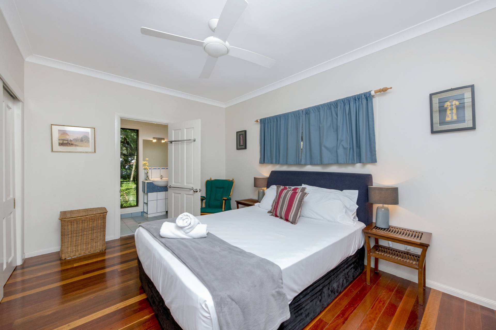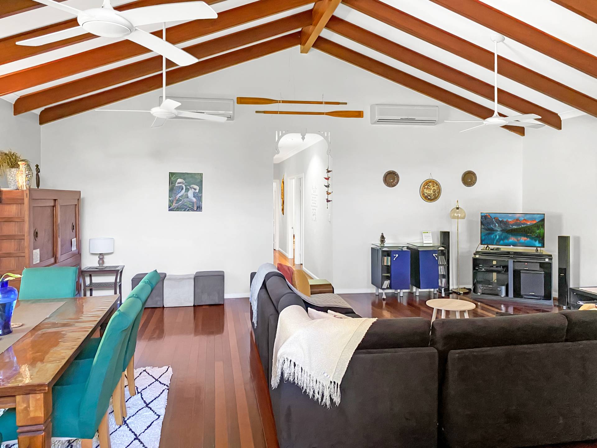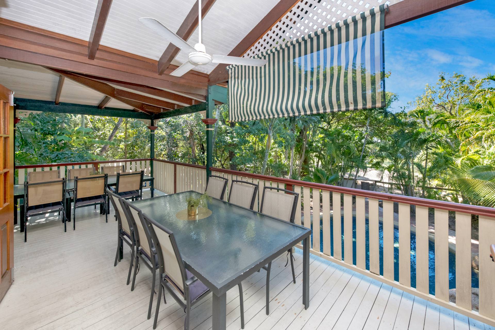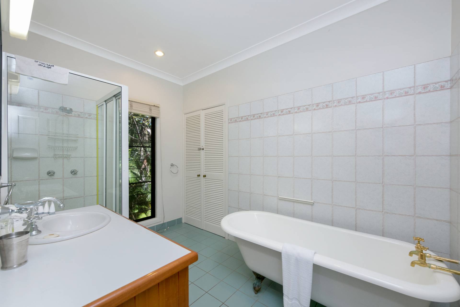 Three of the four upstairs bedrooms open onto the deck through french doors, including the master with its his-and-hers wardrobes and ensuite bathroom. The family bathroom upstairs features a roll-top claw-foot bath with separate shower. The home is fully air-conditioned with screens throughout.