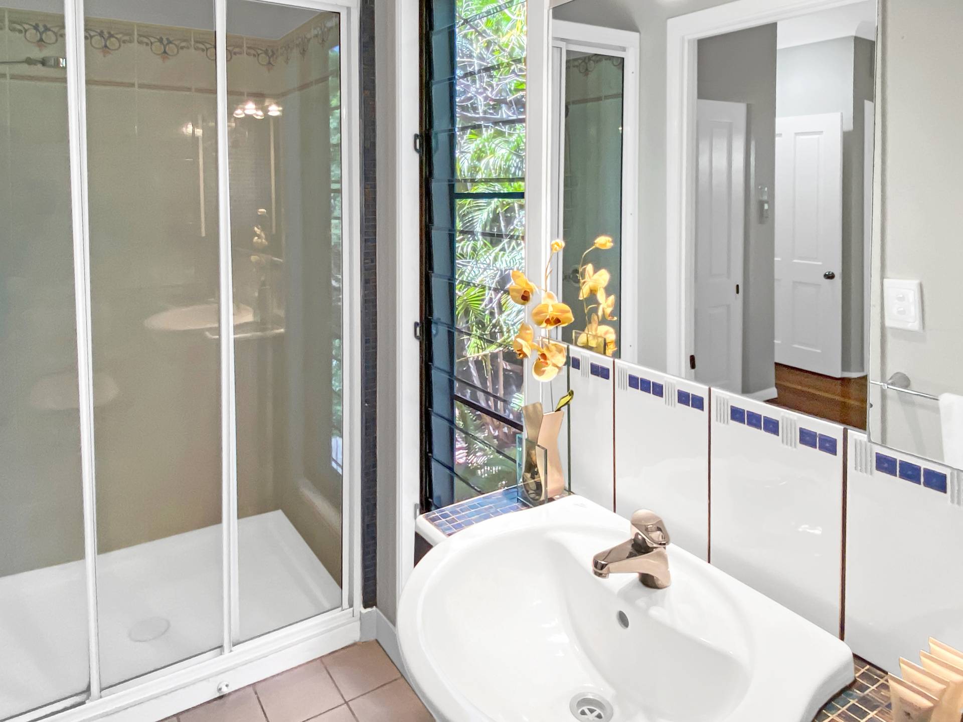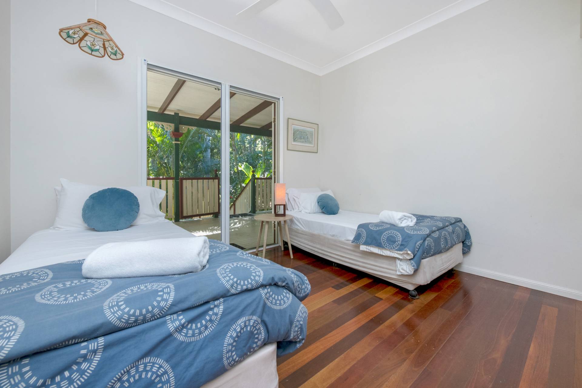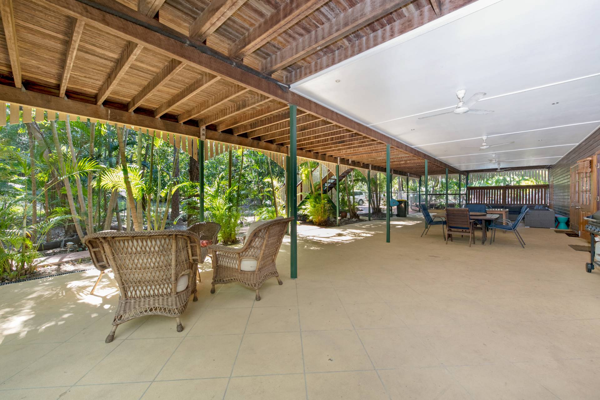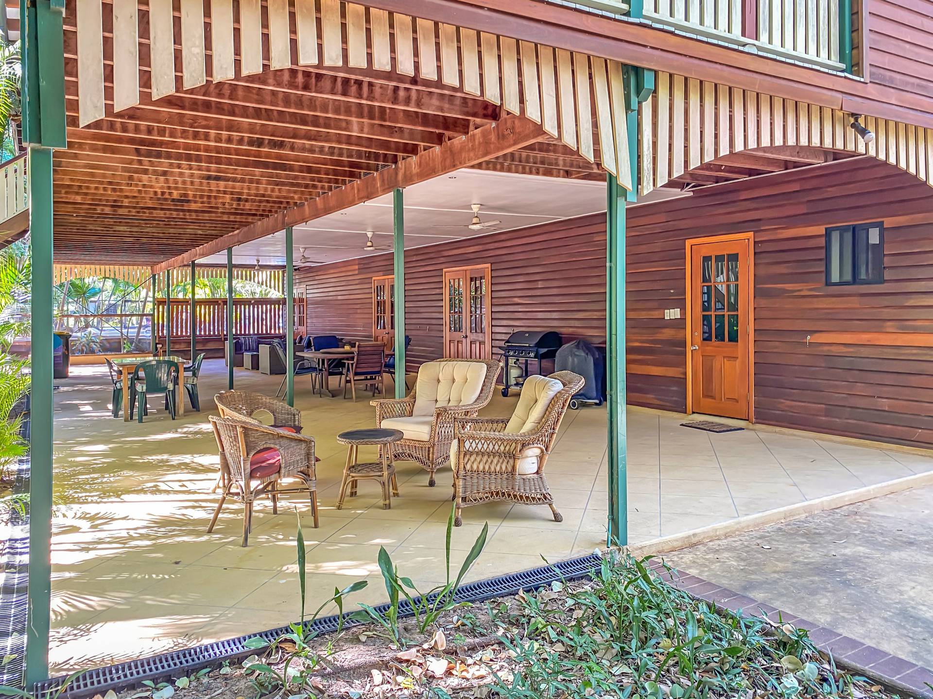 Three of the four upstairs bedrooms open onto the deck through french doors, including the master with its his-and-hers wardrobes and ensuite bathroom. The family bathroom upstairs features a roll-top claw-foot bath with separate shower. The home is fully air-conditioned with screens throughout.
