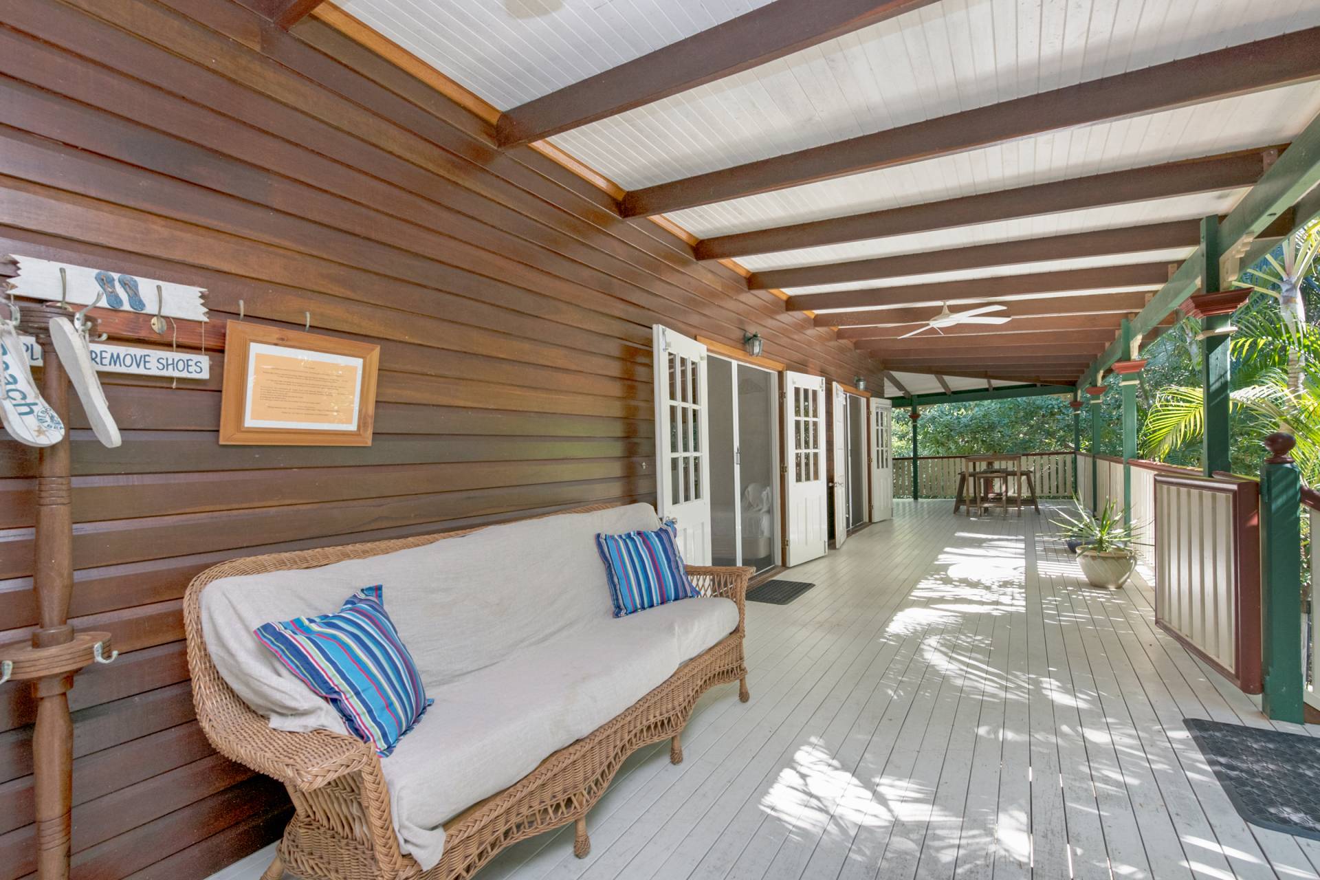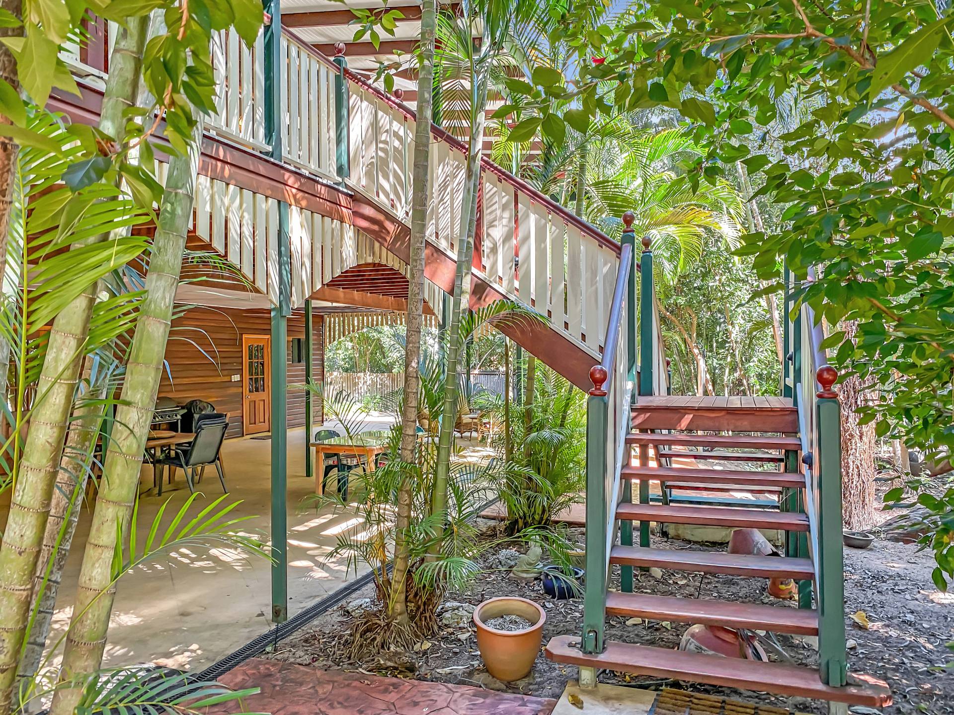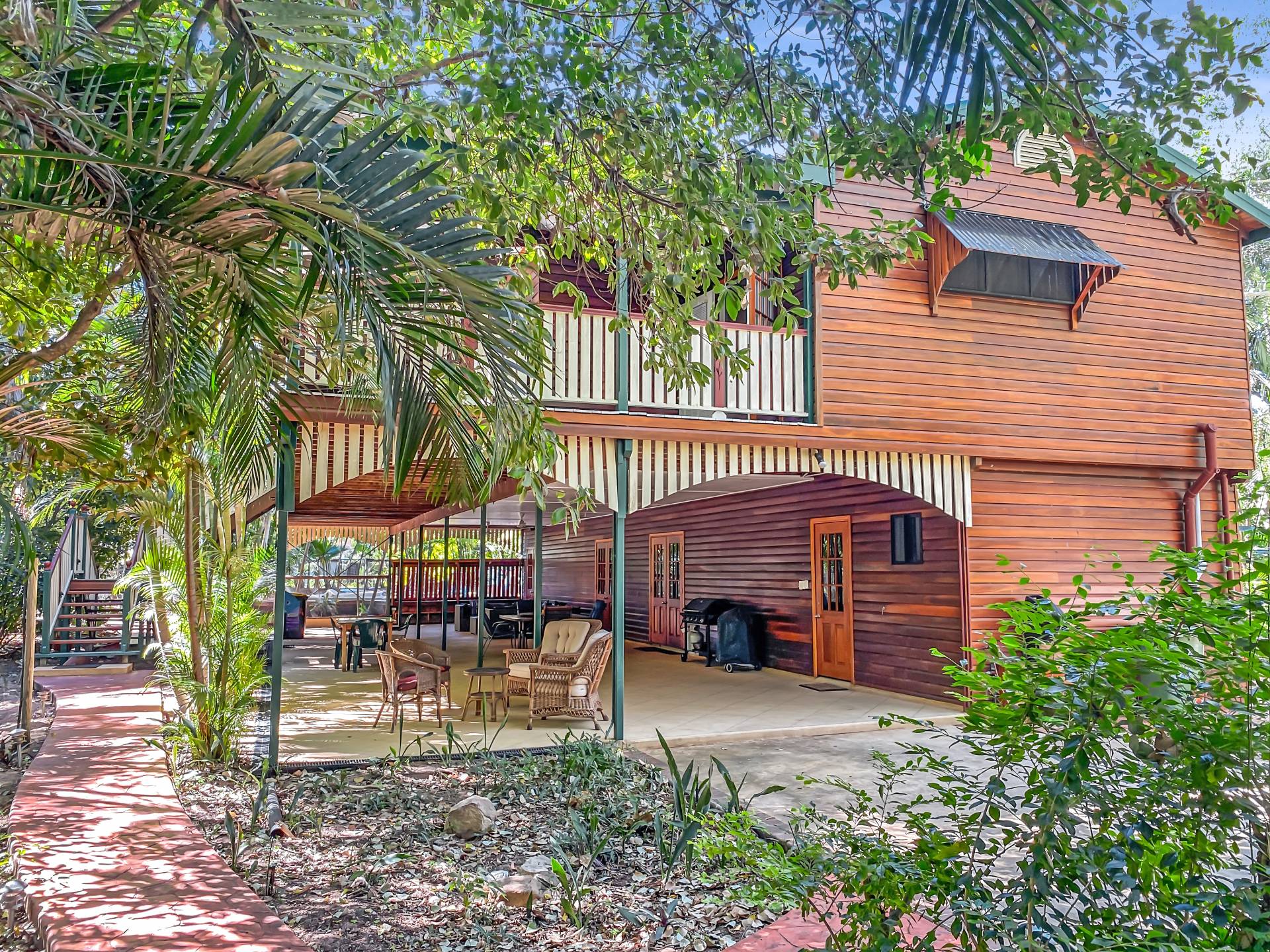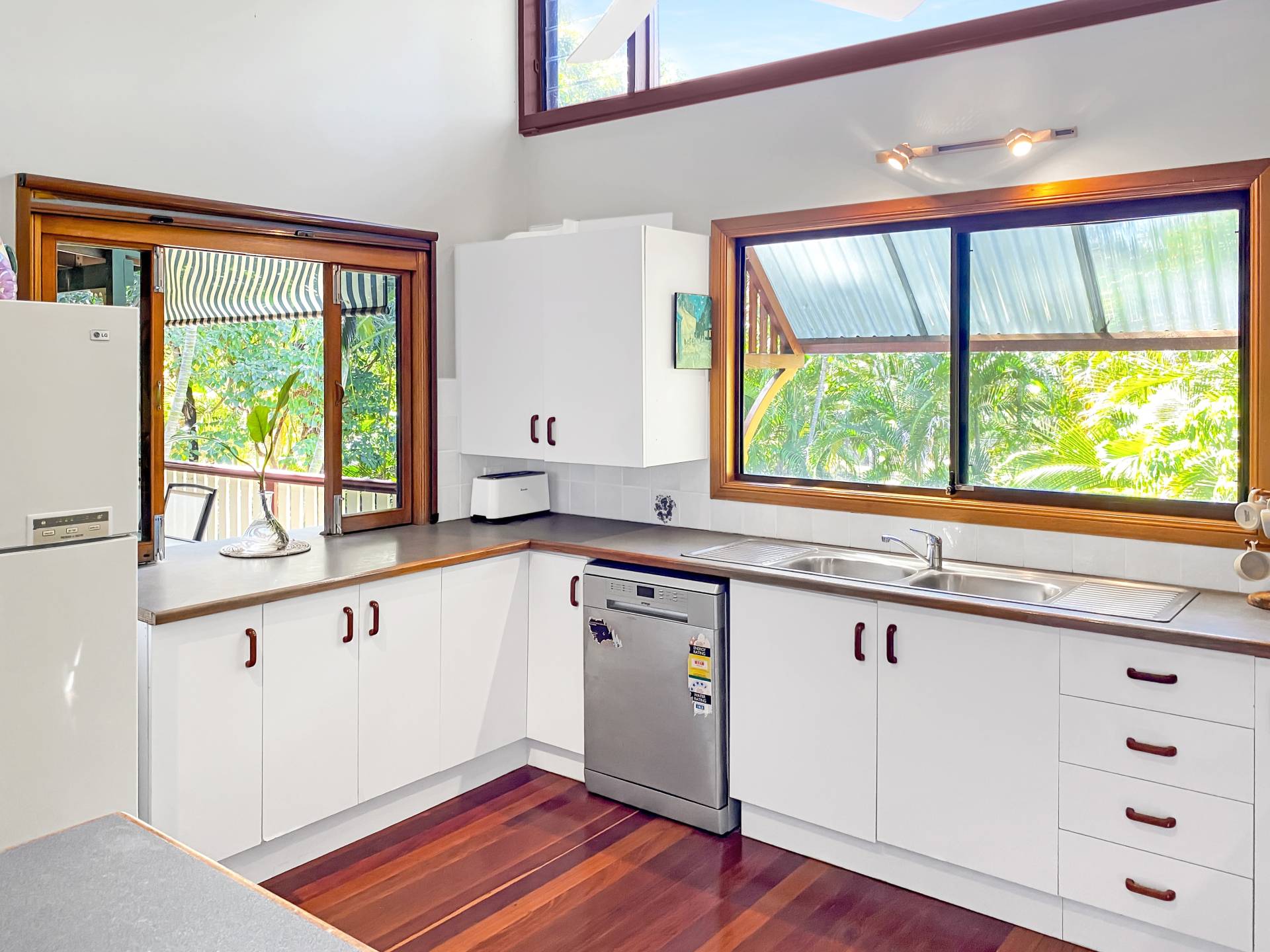 Three of the four upstairs bedrooms open onto the deck through french doors, including the master with its his-and-hers wardrobes and ensuite bathroom. The family bathroom upstairs features a roll-top claw-foot bath with separate shower. The home is fully air-conditioned with screens throughout.