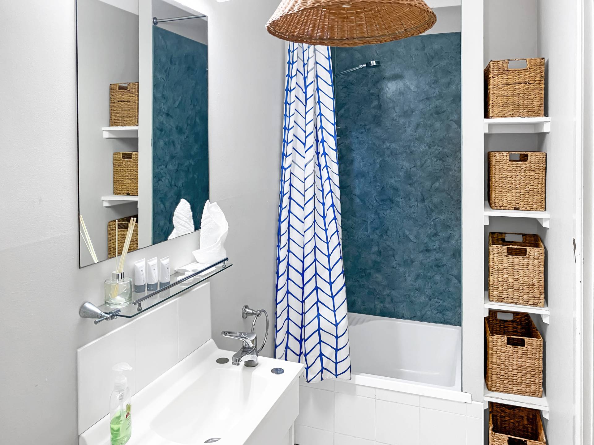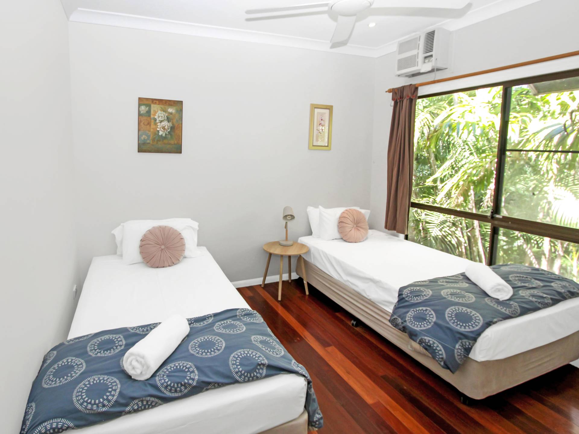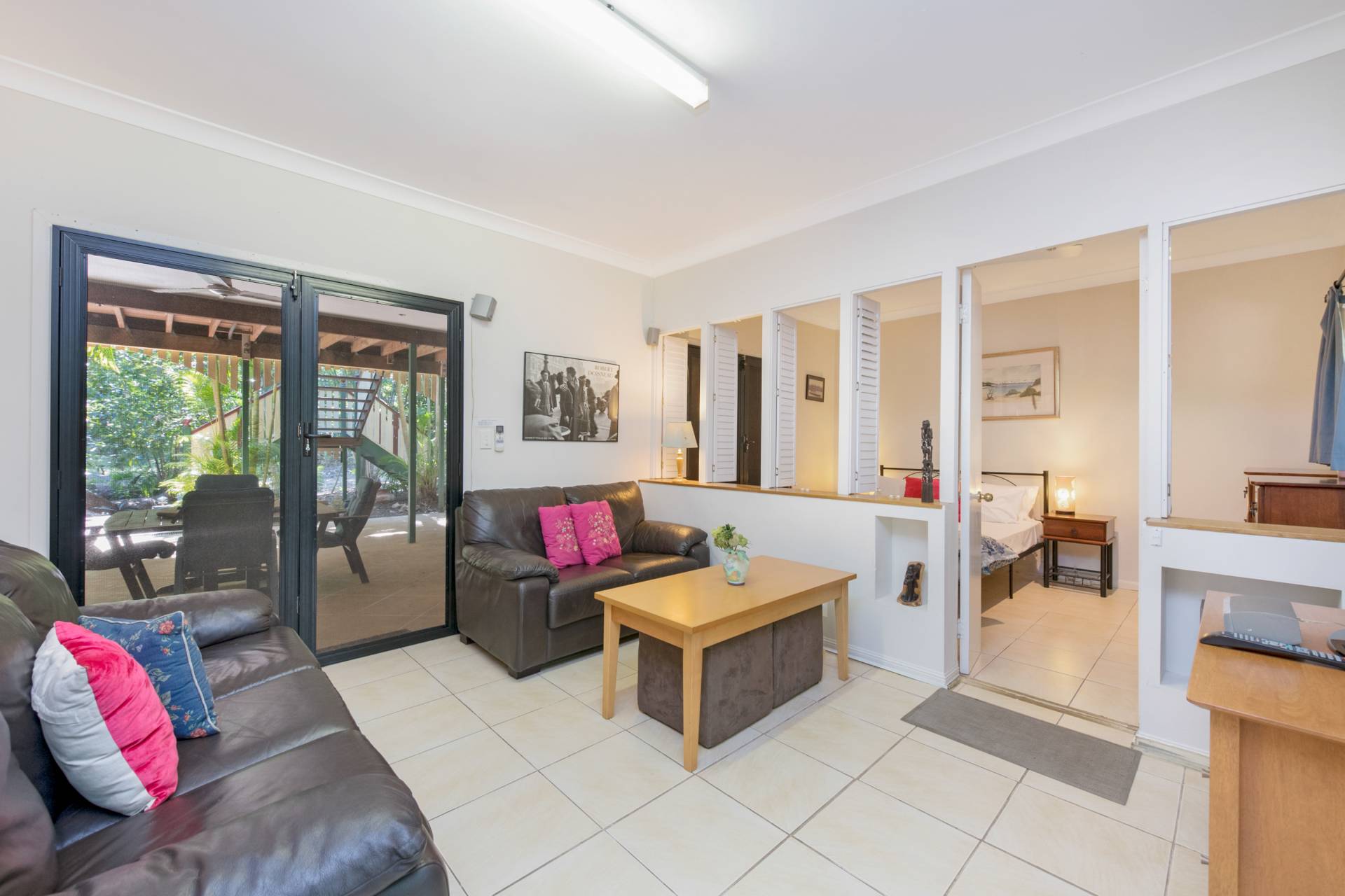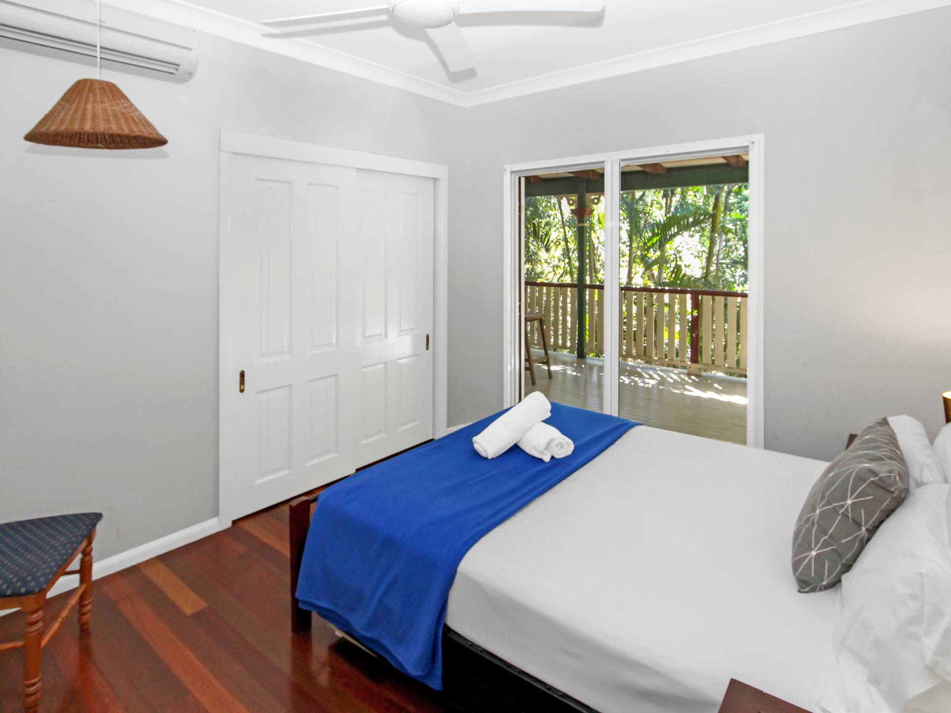 Three of the four upstairs bedrooms open onto the deck through french doors, including the master with its his-and-hers wardrobes and ensuite bathroom. The family bathroom upstairs features a roll-top claw-foot bath with separate shower. The home is fully air-conditioned with screens throughout.