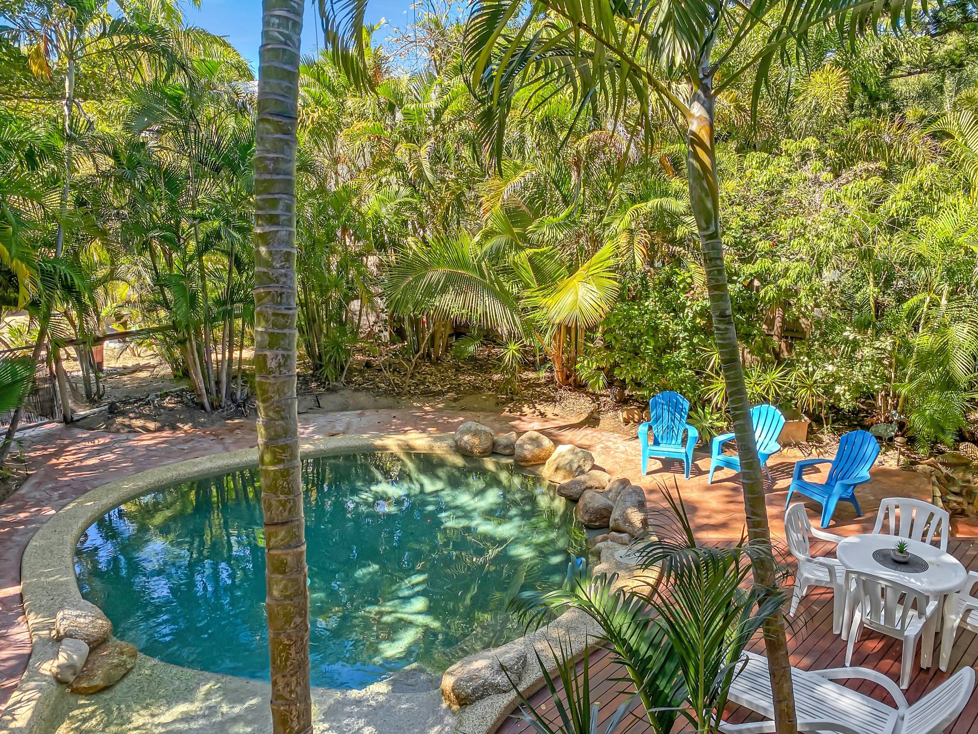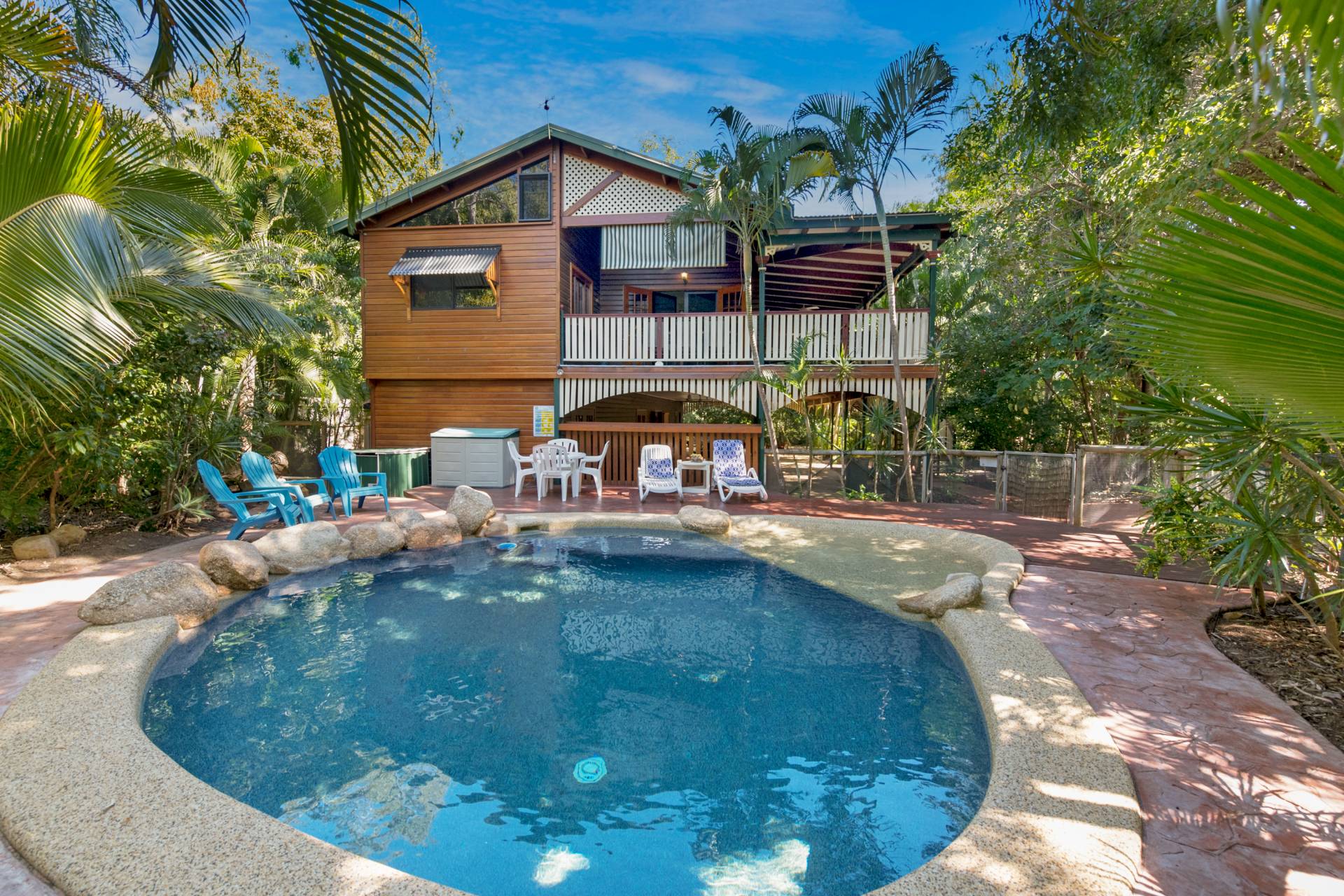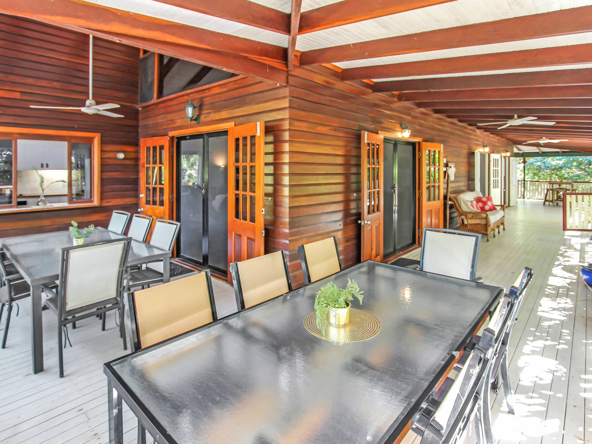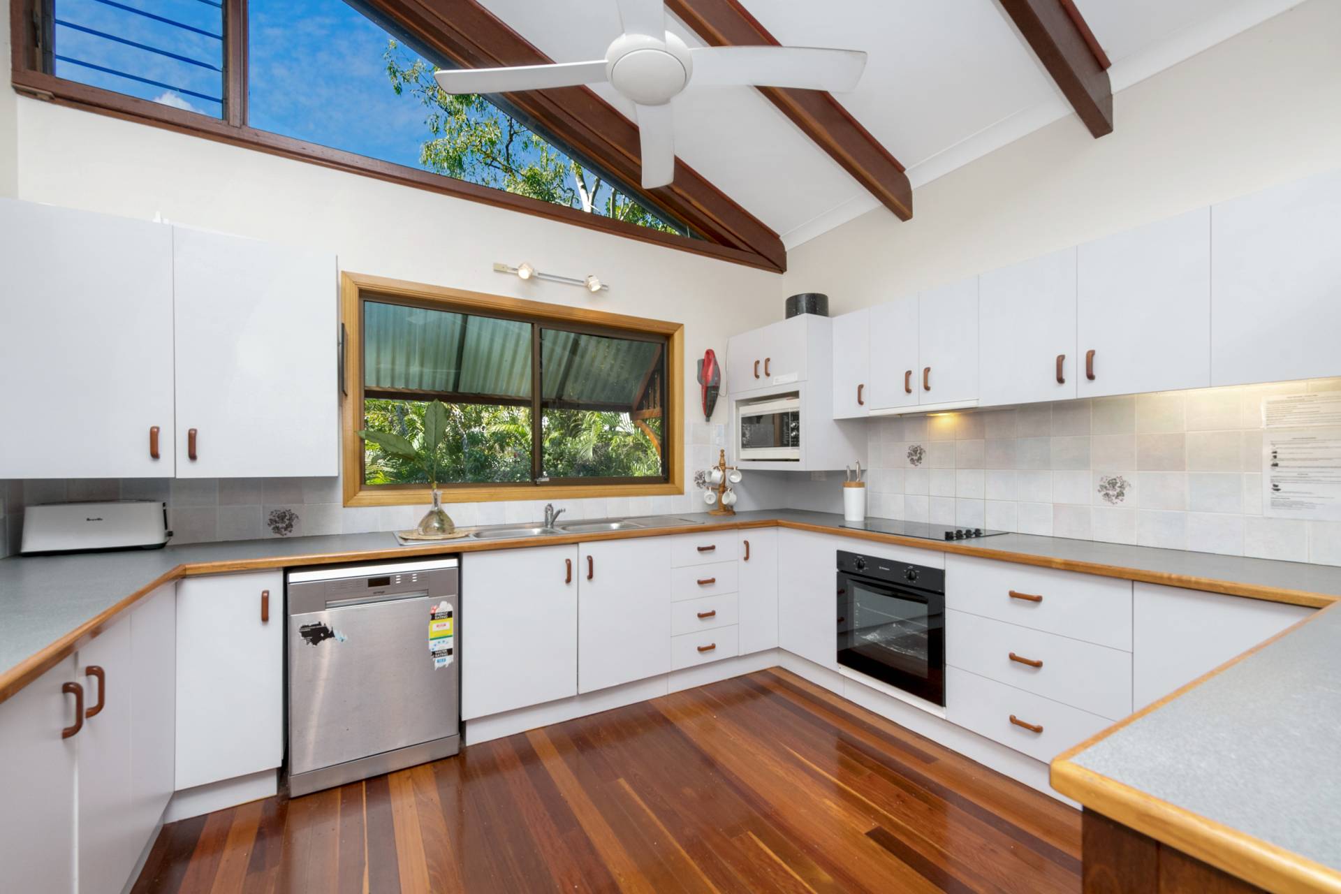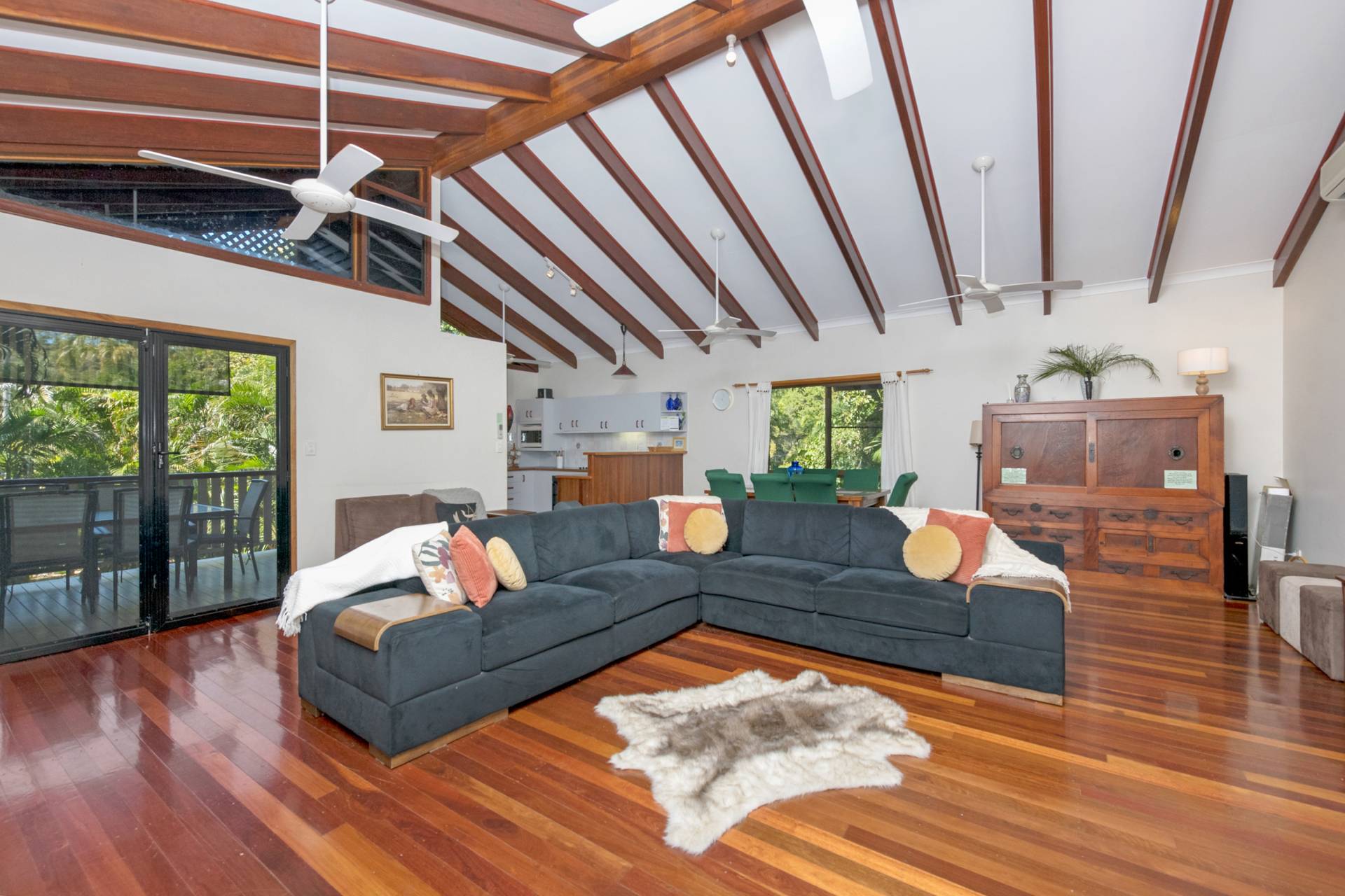 Of hardwood construction, the home has beautiful polished wood floors upstairs and soaring cathedral ceilings to the large open-plan living/dining/kitchen which opens onto the wraparound deck through french doors. The deck offers room for multiple living areas with a large lounge area, dining area being serviced by a servery off the kitchen, and still plenty of room for another lounge area. Keep an eye on the kids in the pool below or have a quiet moment lazing in a hammock reading a book listening to the birdsong in the trees around.