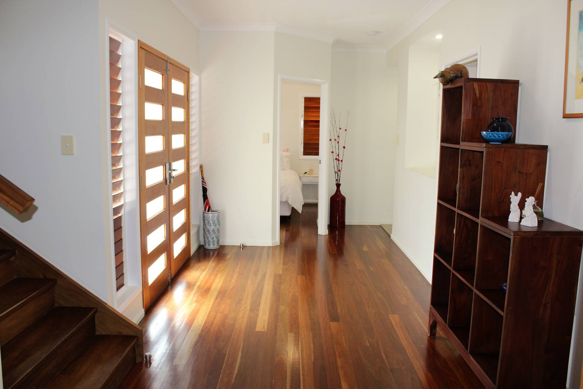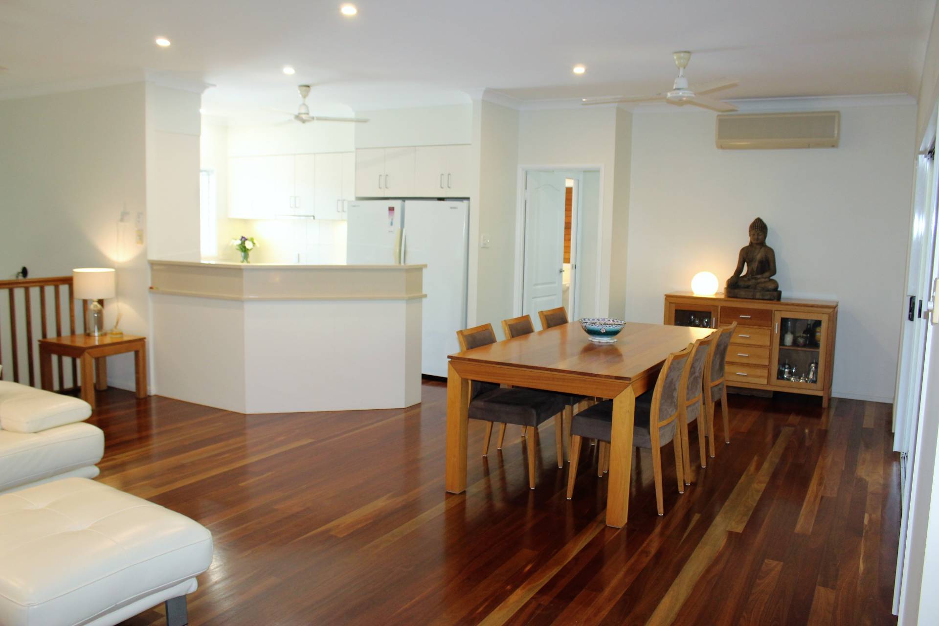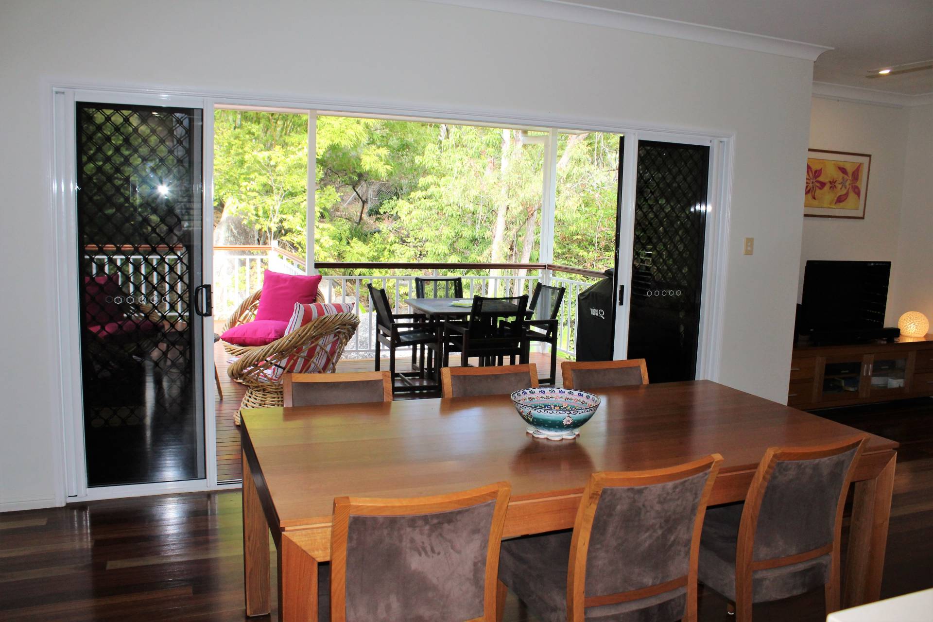 Up the smart wooden staircase, the cool bright living area opens up in front of you with the views to the garden and National Park behind. The hardwood floors and high ceilings throughout this property make this home warm and generous whilst the use of louvre windows and lots of doors and windows with ceiling fans and air con throughout will keep you cool in any weather. The kitchen features stone benchtops, corner pantry, pyrolitic oven, dishwasher and double sink with plenty of bench and cupboard space as well as space for a large double door fridge. Sliding doors open up onto the covered deck beyond, blending indoor/outdoor entertaining areas with ease.