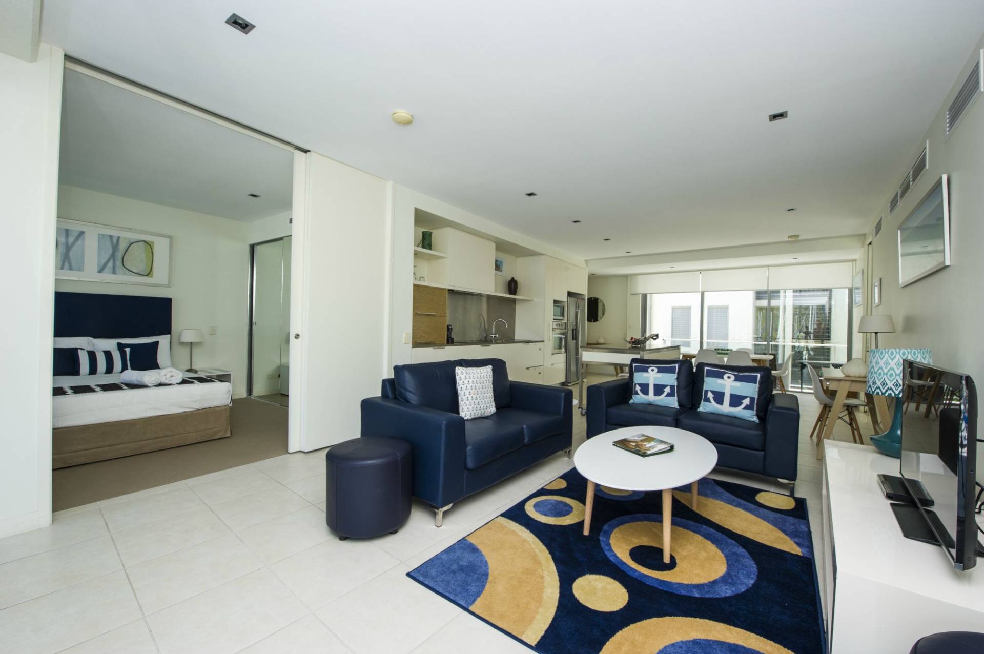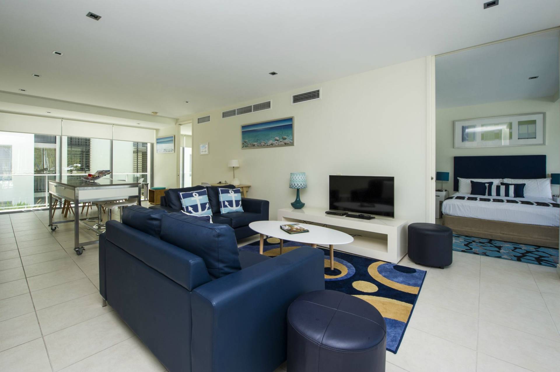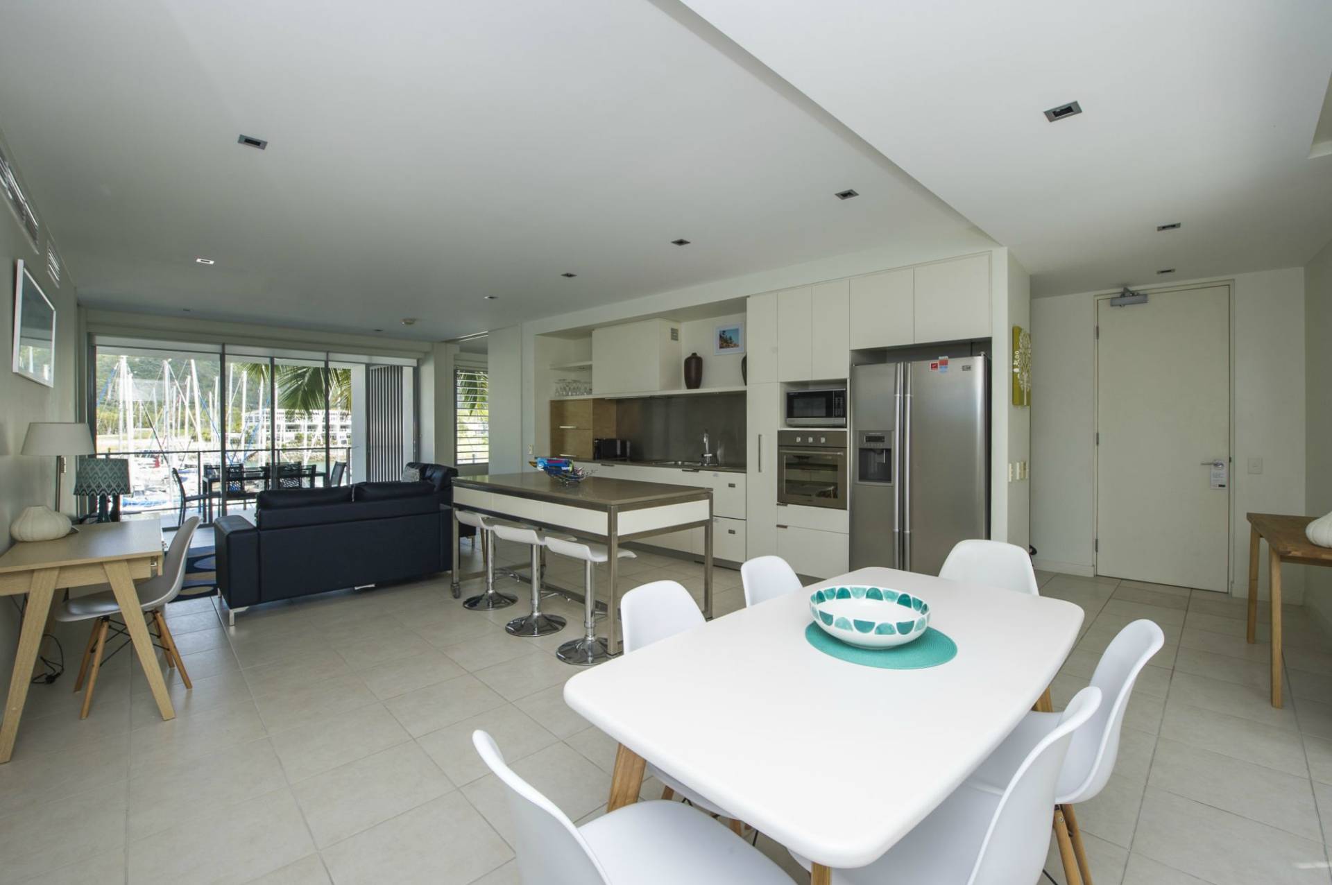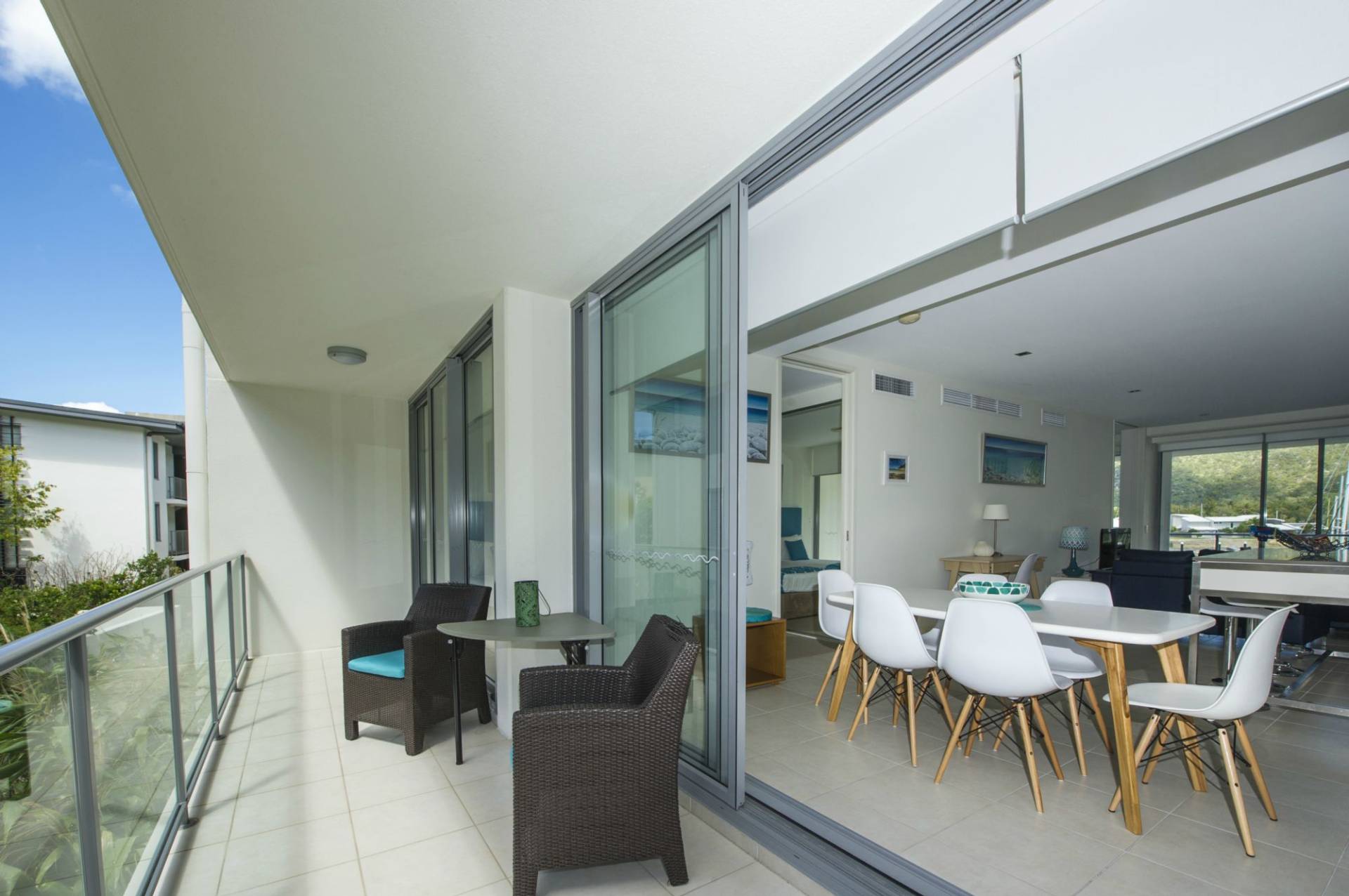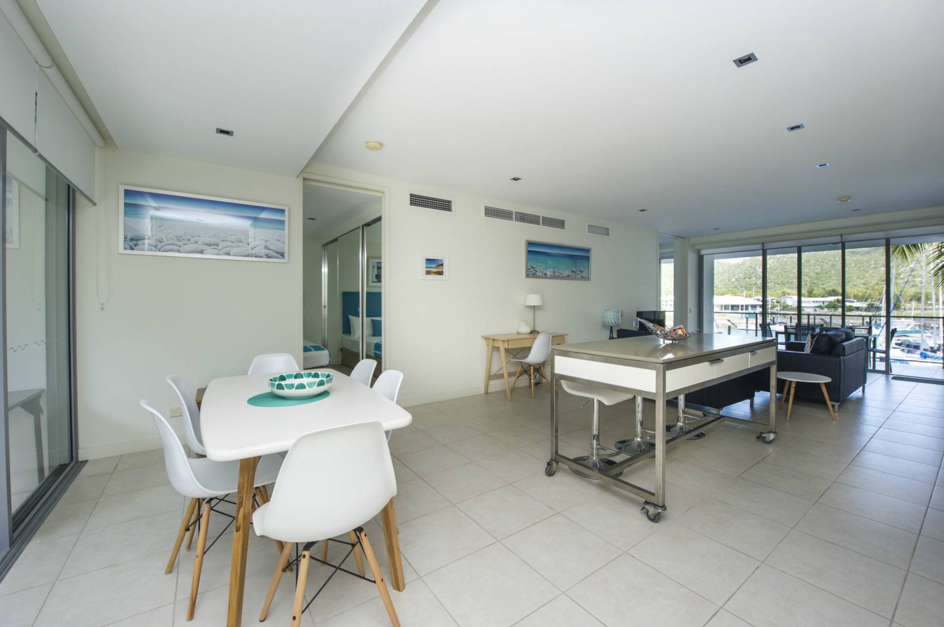 The apartment is offered fully furnished, ready to move into or let out, or simply as your private Island getaway. The open-plan living area opens up through floor-to-ceiling glass doors at either end onto spacious covered verandahs allowing the cross-breeze to flow through and bringing plenty of light in.