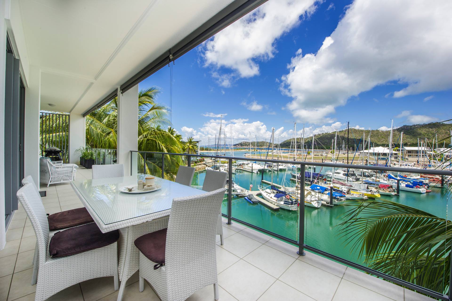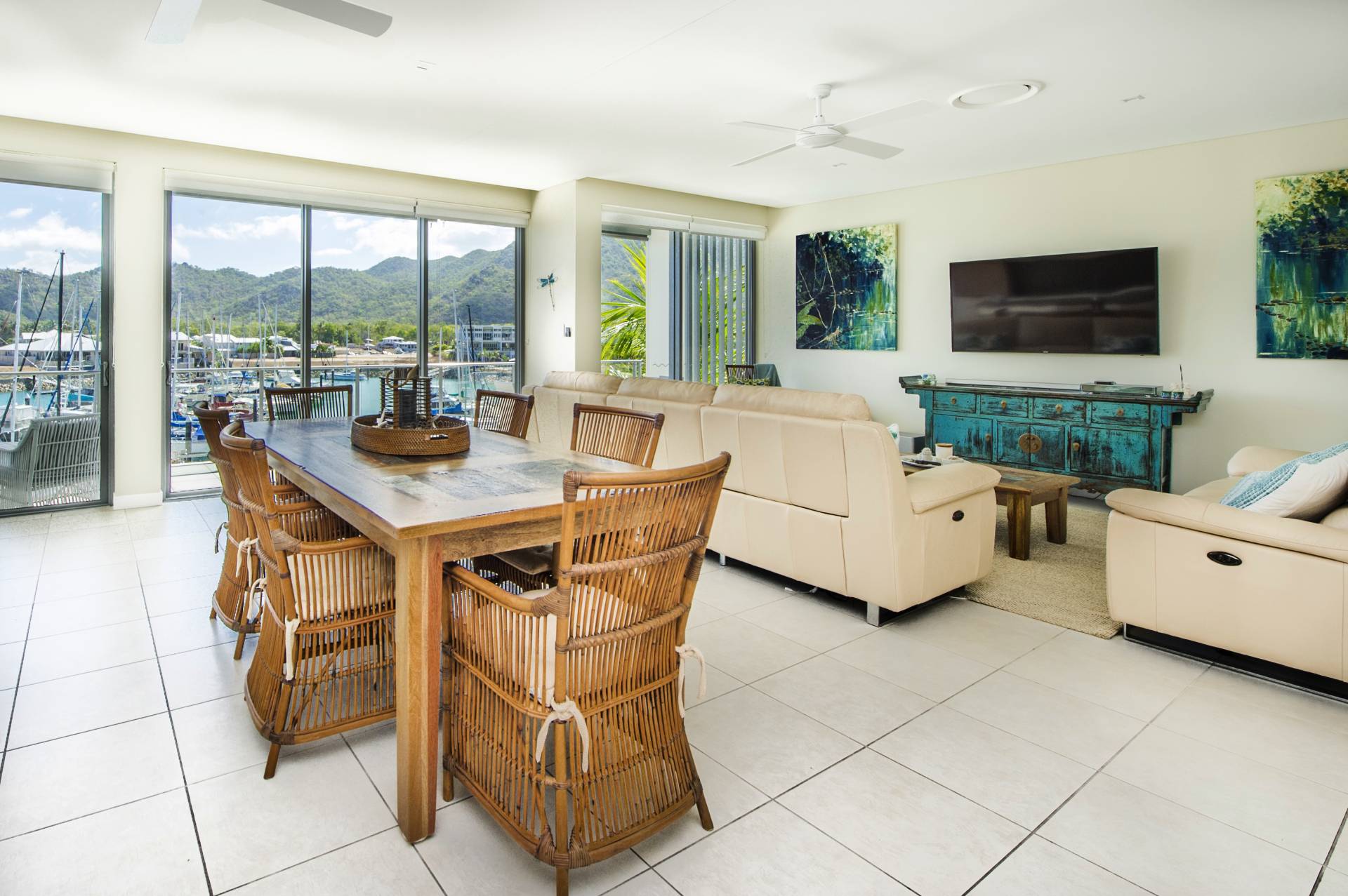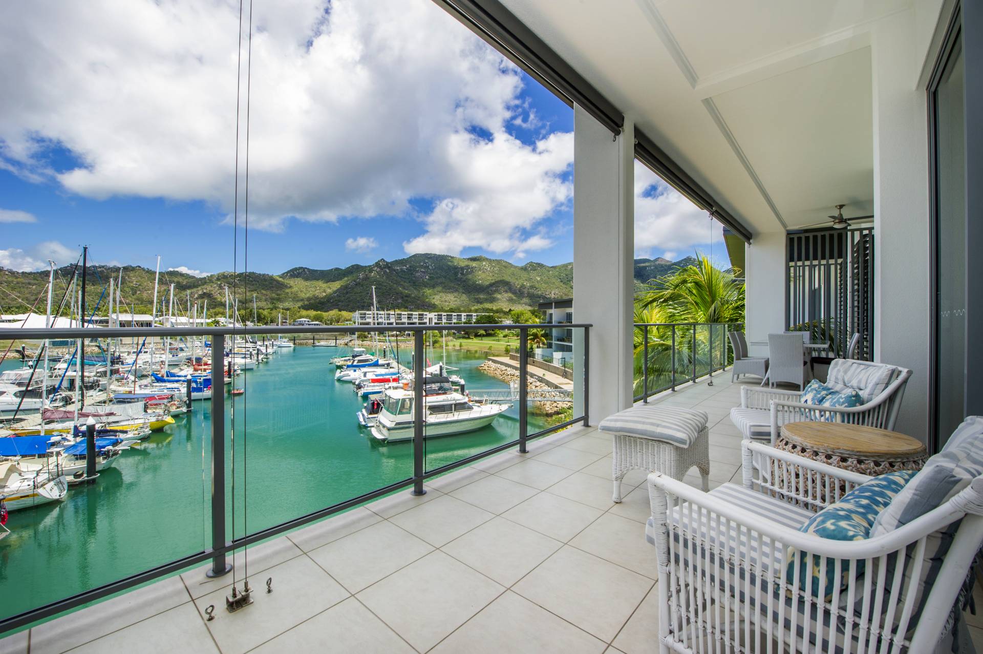 An opportunity arises to purchase a premier penthouse apartment on Magnetic Island. This huge 300m2 apartment comprises 3 bedrooms, office, 2 bathrooms plus a powder room, 2 living rooms, three decks totalling 107m2 and is surrounded by water with stunning views over the Magnetic Marina and Coral Sea to the mainland on one side, and on the other, across the lagoon pool to the pretty boulder-strewn green hills of the island.