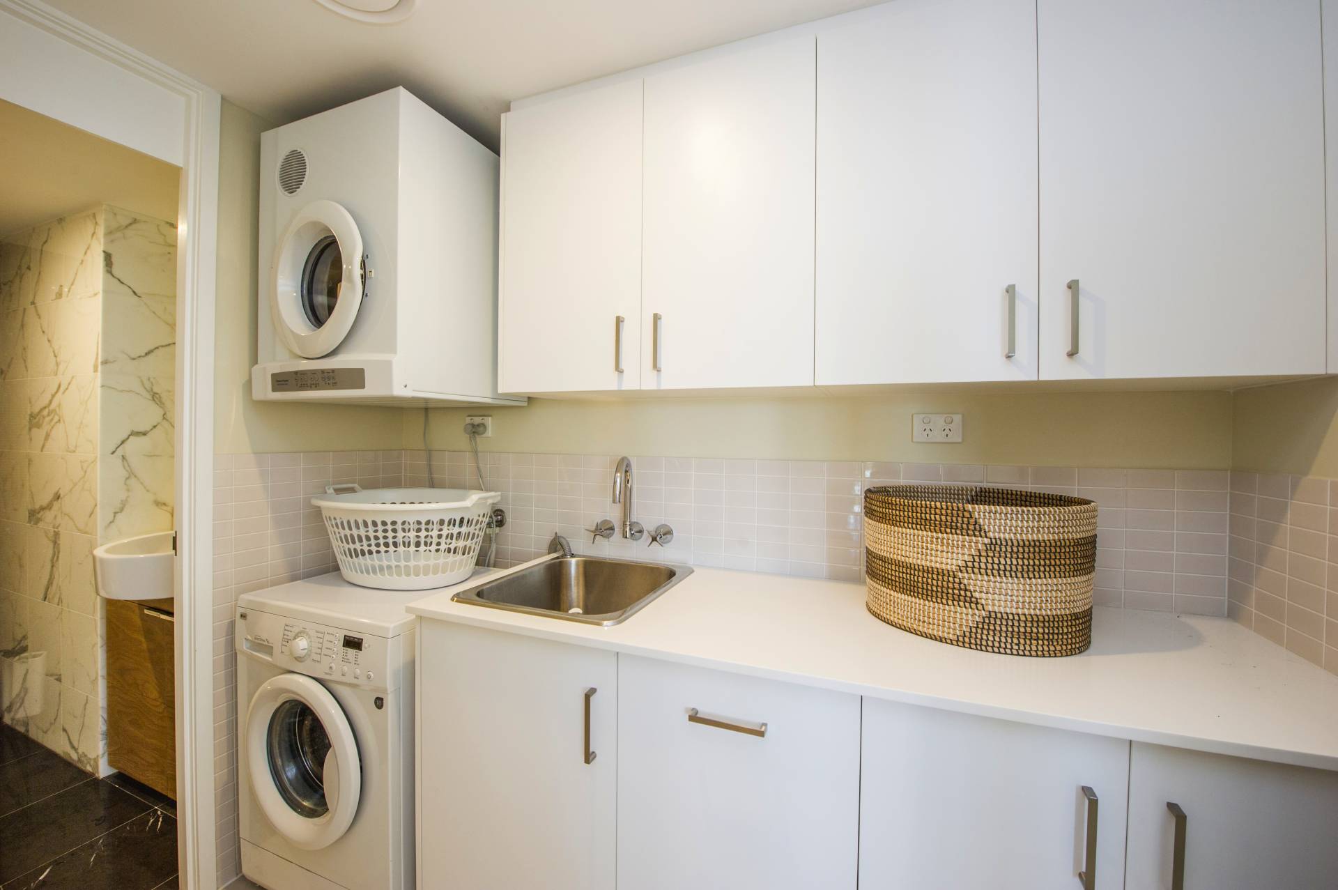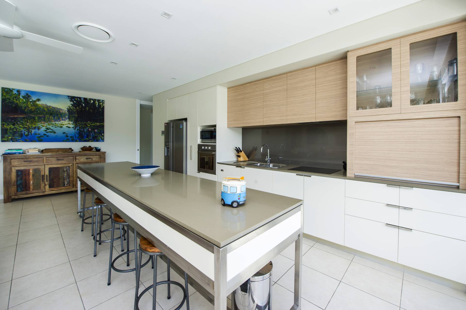* The stylish modern kitchen is made for entertaining with double door fridge, double drawer dishwasher, hidden appliance cupboards, and a moveable island bench