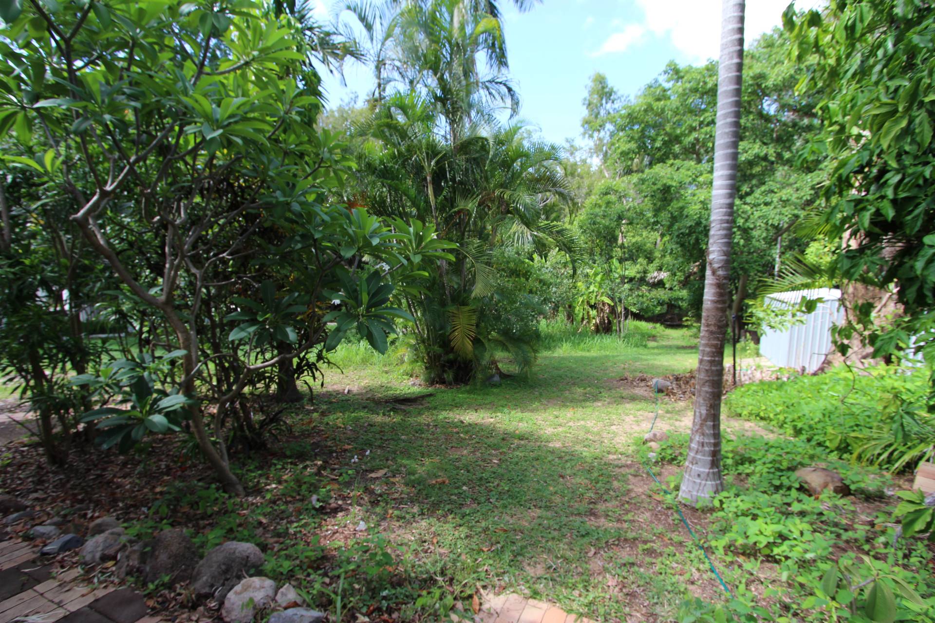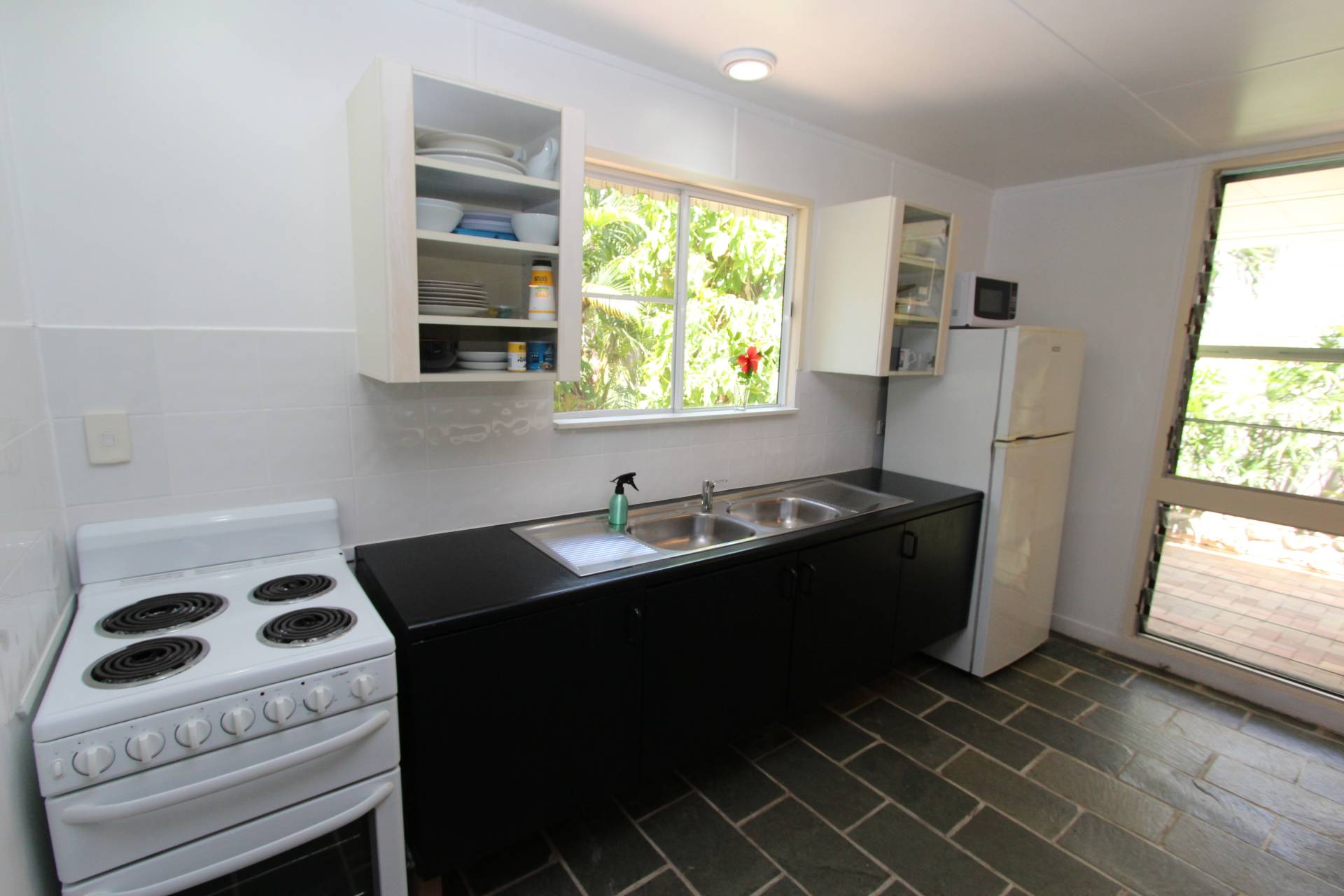 Two bedrooms open off the living area on one side, both with banks of timber louvres on two walls and a ceiling fan. The main bedroom is larger with a built-in-cupboard and louvres at both ends, again for excellent cross-ventilation with ceiling fan and air-con. Adjacent to the main bedroom is the bathroom/laundry with shower over a bath which could quite easily be changed to a walk-in shower.