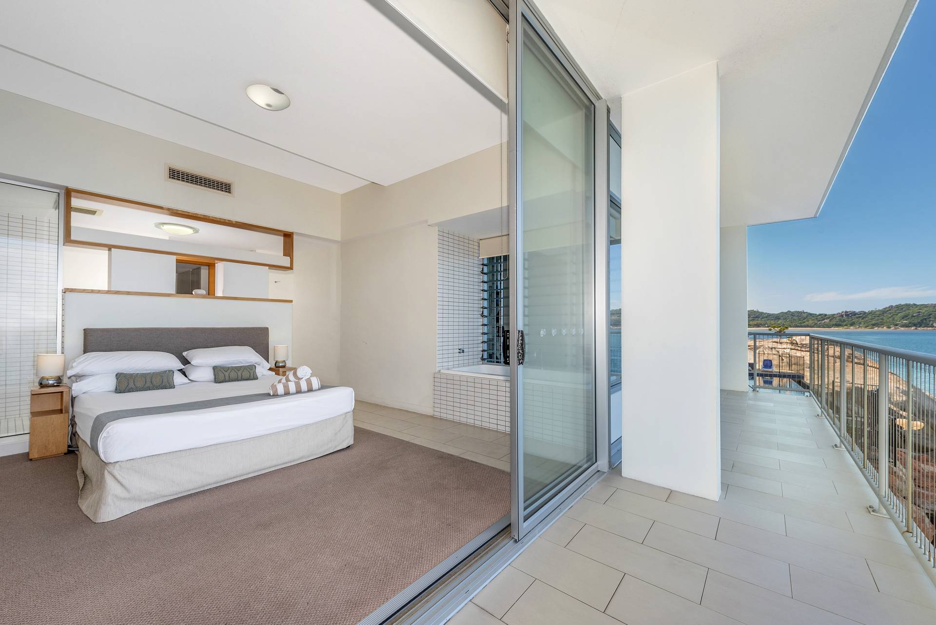* Master bedroom and living area open up onto the balcony through floor-to-ceiling glass doors to create a seamless transition so it almost feels like you're on a boat