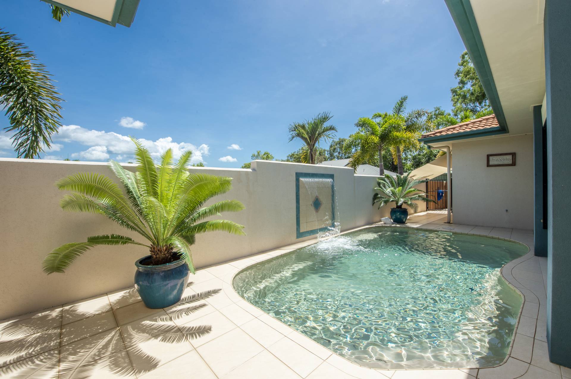The double timber front doors provide an impressive formal entry and the home opens up before you as you step inside with a window into the pool area and the main living area in front of you, with the formal lounge to the side. Both living areas as well as the master bedroom have large sliding doors opening onto the covered outdoor entertaining area for seamless indoor-outdoor transition. The pool is private with a waterfall feature and subtle glass fencing.