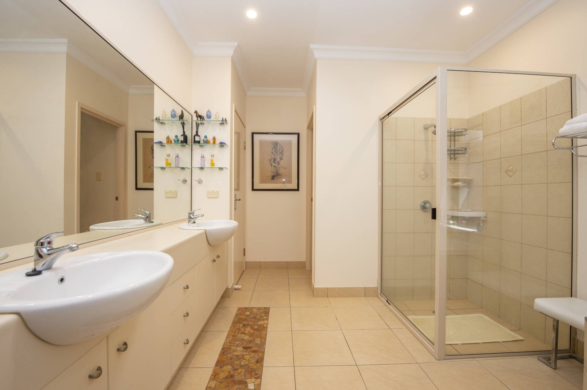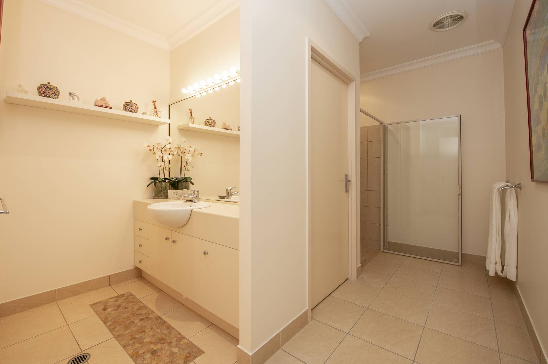 The master bedroom is generous in size with a large walk-in wardrobe and ensuite bathroom with corner spa bath, separate shower, private toilet, and his-and-hers vanity. The second and third bedrooms are also generously sized, both with built-in-wardrobes and one with sliding doors opening into the garden.