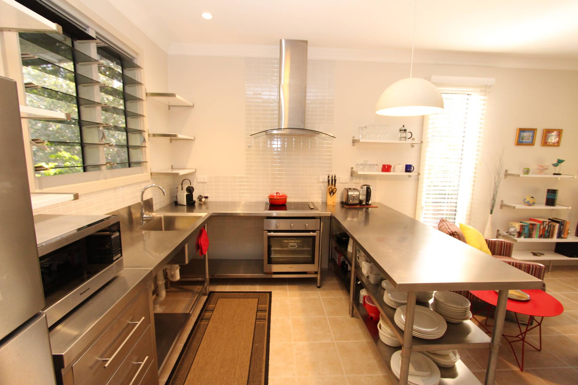 Covered decks front and back offer outdoor entertaining options whatever the weather, and crimsafe screen doors and louvre windows allow the beautiful breezes to flow through whilst maintaining security (not that there's much need for it here!). High ceilings and doors throughout also assist in cooling the home and make it feel lovely and spacious, especially in the light-filled open-plan living area. Low maintenance practicality continues in the kitchen which is of a simple stainless steel construction with deep sink, plenty of benchspace & shelves, oven, cooktop and rangehood.