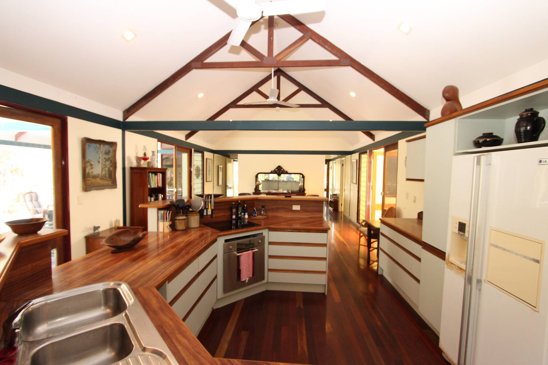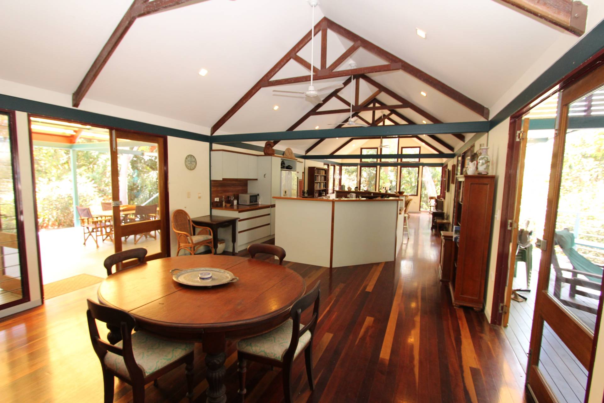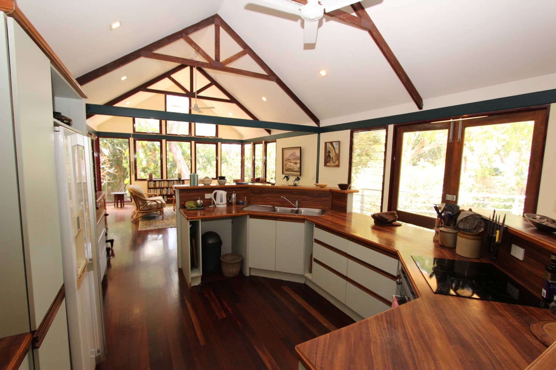 With a wall of glass at one end of the large open-plan living area, the creek flows gently below in wet season, and cool sea breezes penentrate all year round. The kitchen is central to both the lounge and dining areas - as well as opening onto both decks so entertaining is a breeze and you will rarely want to sit indoors for a meal in such a spectacular setting. High ceilings, exposed beams and polished wood floors create character and warmth, whilst the sea views are glimpsed throughout.
