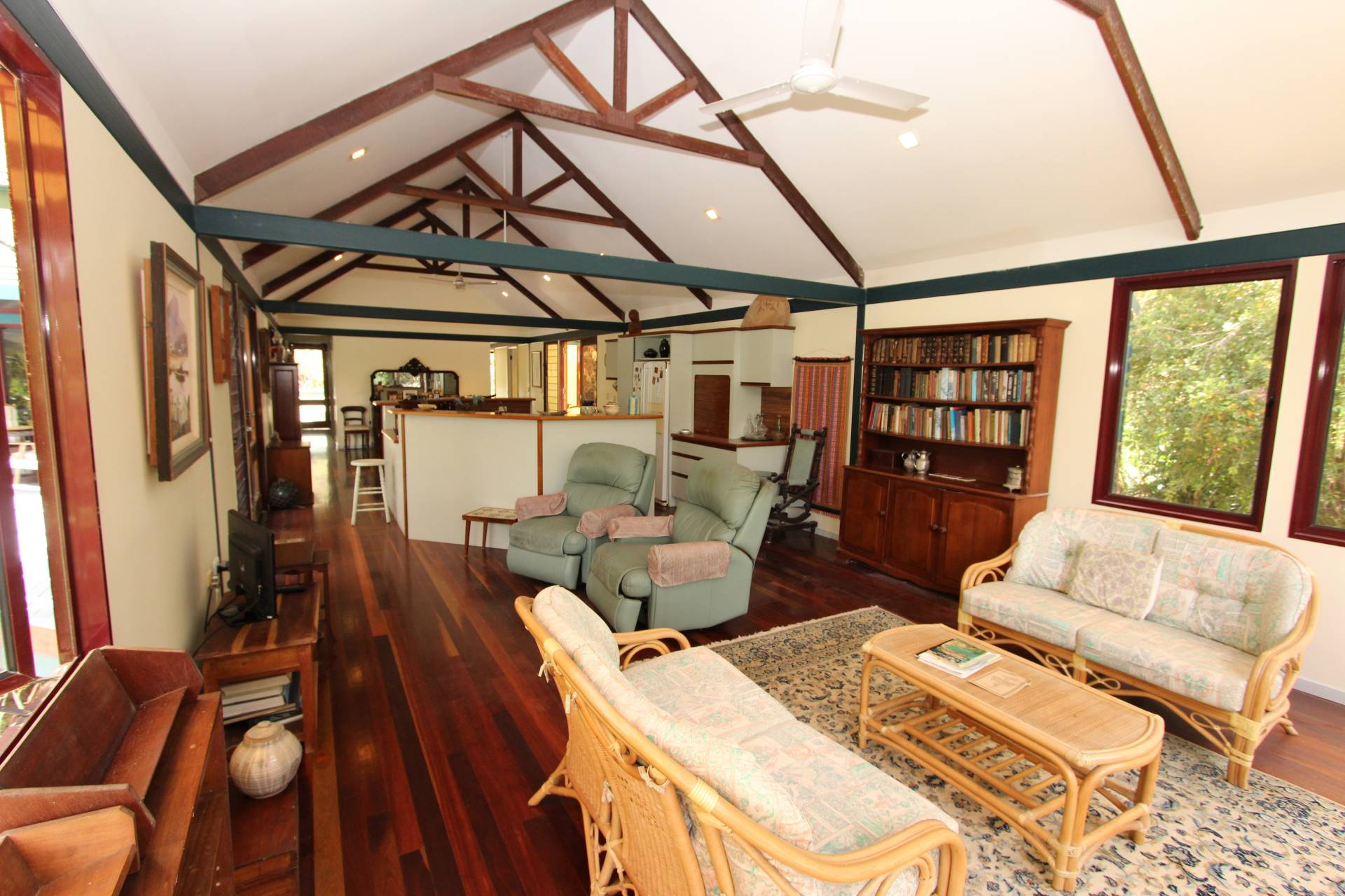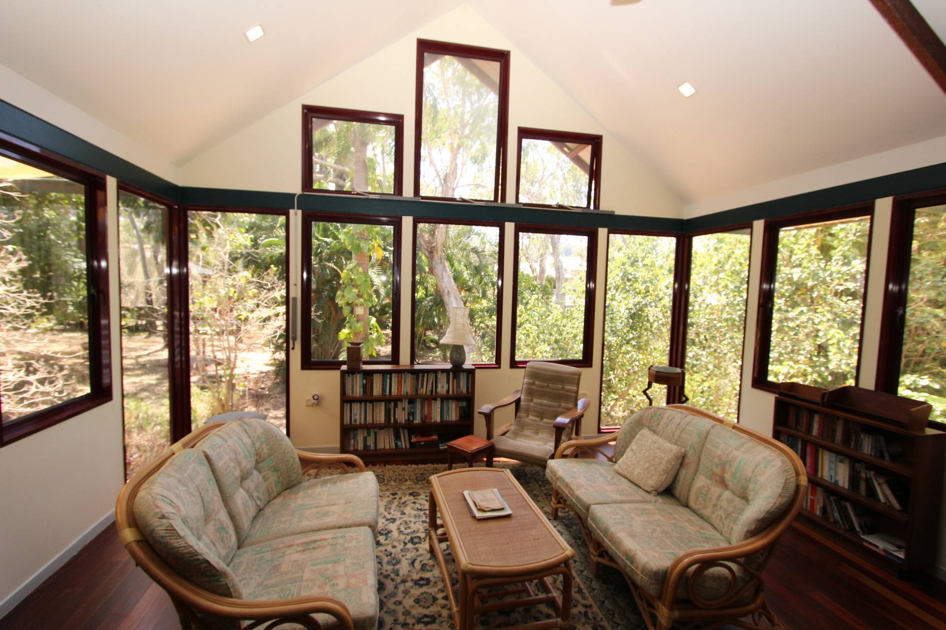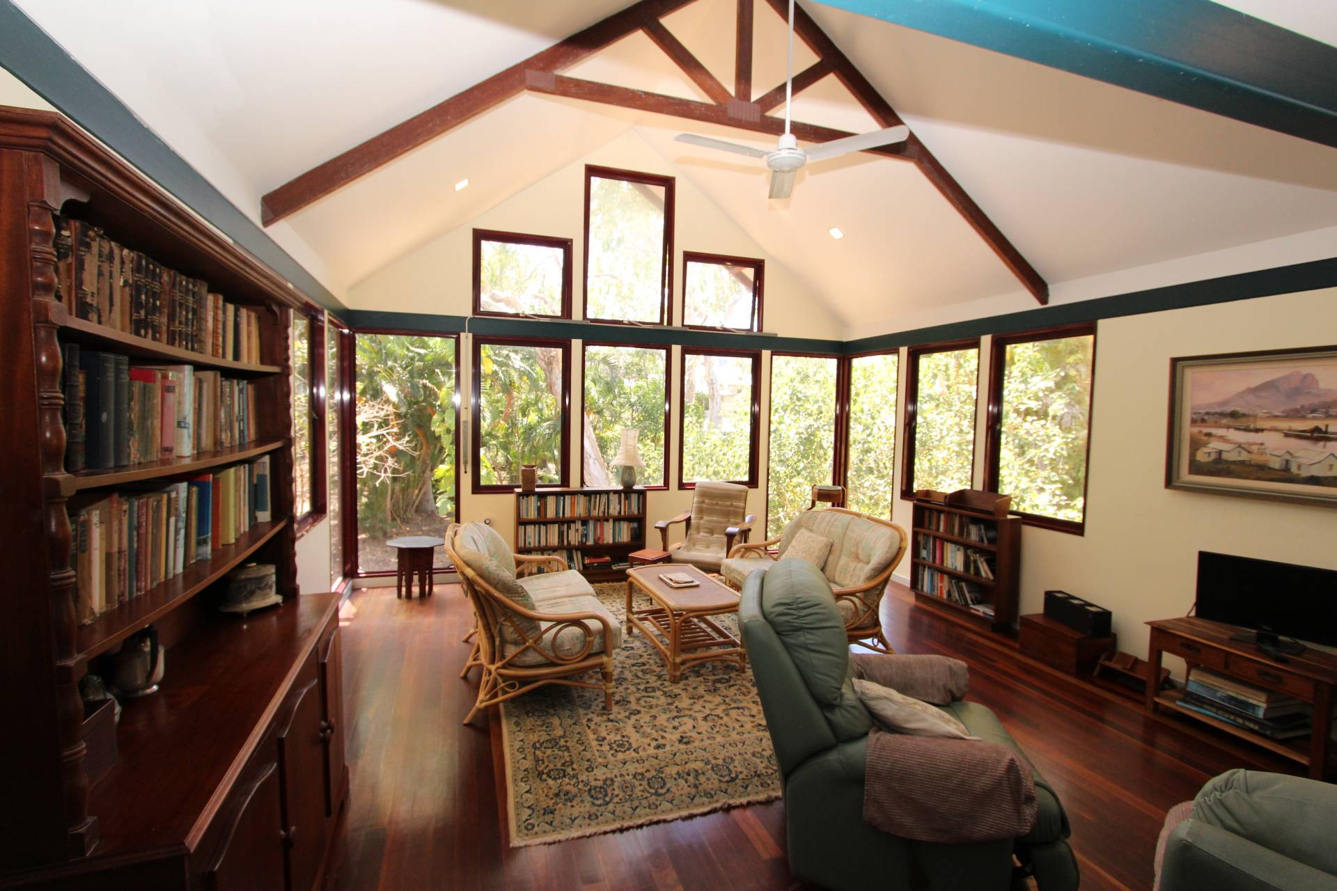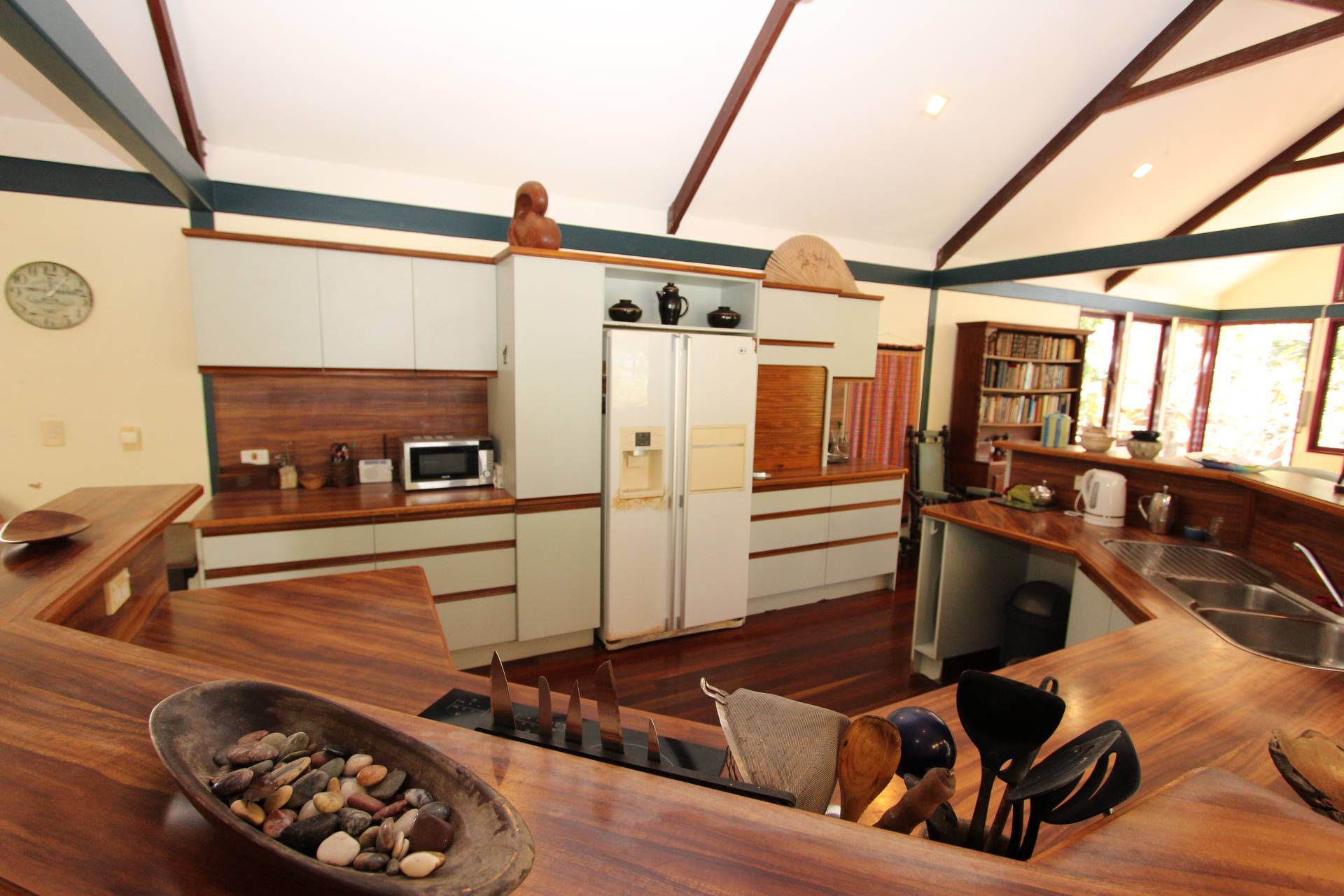 With a wall of glass at one end of the large open-plan living area, the creek flows gently below in wet season, and cool sea breezes penentrate all year round. The kitchen is central to both the lounge and dining areas - as well as opening onto both decks so entertaining is a breeze and you will rarely want to sit indoors for a meal in such a spectacular setting. High ceilings, exposed beams and polished wood floors create character and warmth, whilst the sea views are glimpsed throughout.